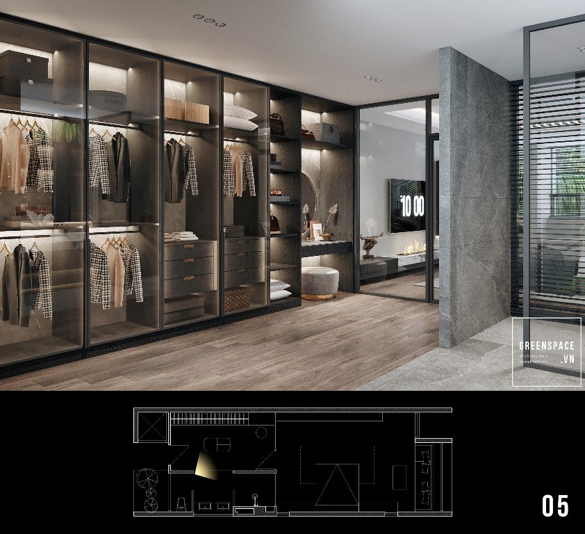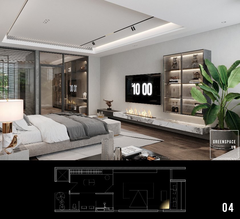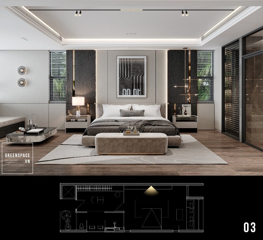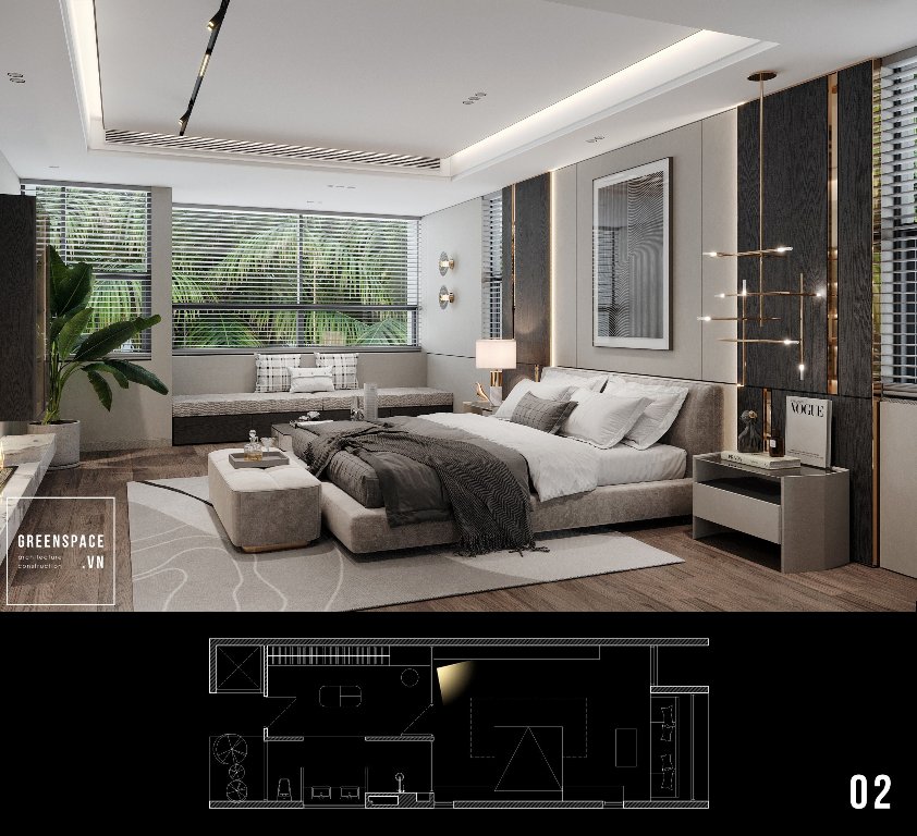 Thiết kế nội thất phòng ngủ nhà phố hiện đại, không gian thoáng đãng và tiện nghi. Phòng ngủ master tích hợp phòng thay đồ và nhà vệ sinh.