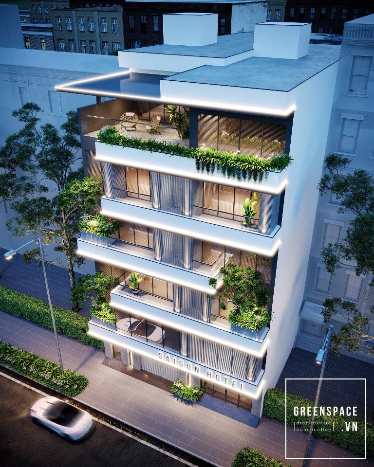 Tính ưu việt về kiến trúc của công trình khách sạn kết hợp nhà ở này được thể hiện rõ qua việc áp dụng xu hướng hình khối kiến trúc mới nhất năm. Cùng với việc tăng cường mảng xanh và thiết kế chiếu sáng nghệ thuật. Đội ngũ KGX đã tính toán khối nhà cũ và kết nối ban công giữa hai khối cũ – mới một cách hợp lý ở các phần chênh cao độ. Giúp công trình đảm bảo được chiều cao thông thủy và tối ưu hóa diện tích các tầng. Có thể thấy ở đây tối đa được không gian ban công và số phòng cho mục tiêu kinh doanh.