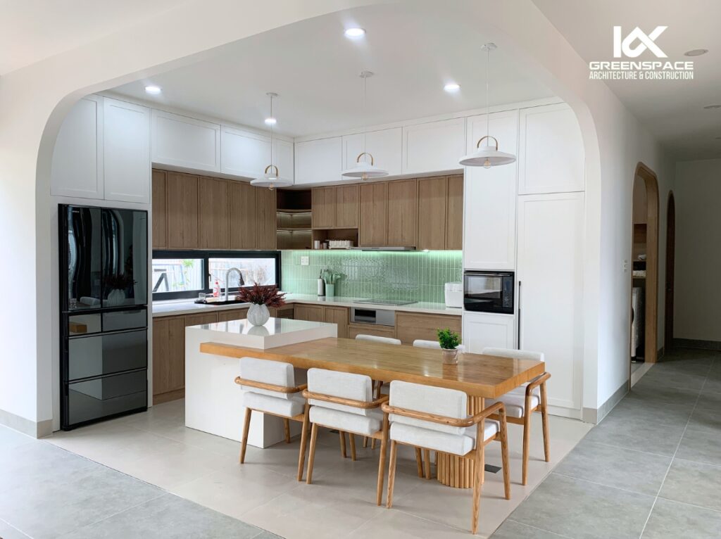 Không gian bếp được gia chủ ví vui như “vedette” của biệt thự. Từ màu sắc, bố trí và vật liệu đều y như từ bản vẽ bước ra. Không chỉ gia chủ hài lòng mà bất kì vị khách nào khi ghé thăm gia đình đều dành rất nhiều lời khen cho khu bếp.