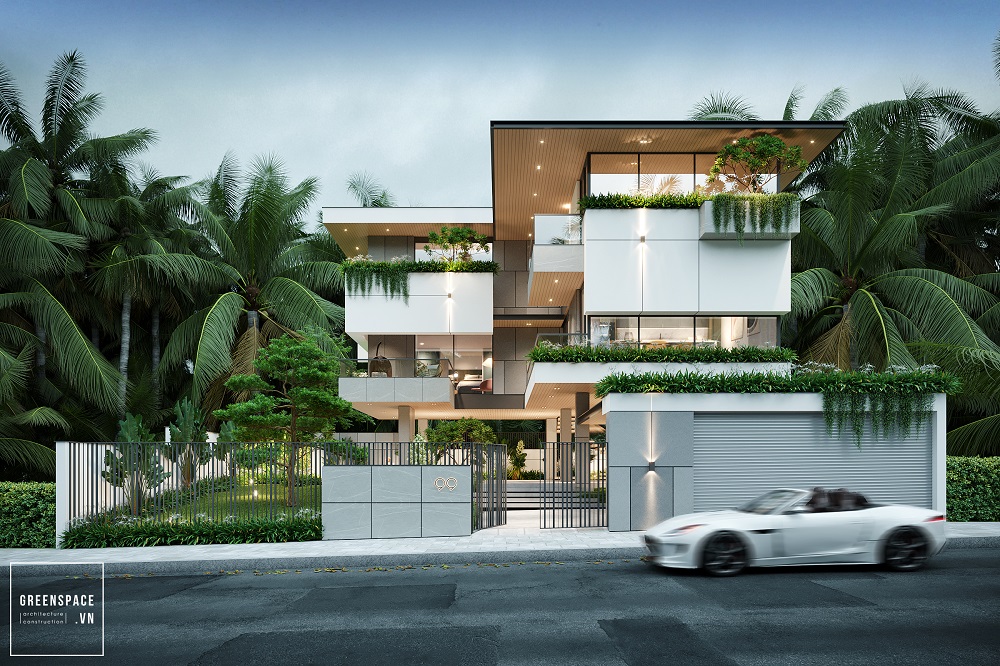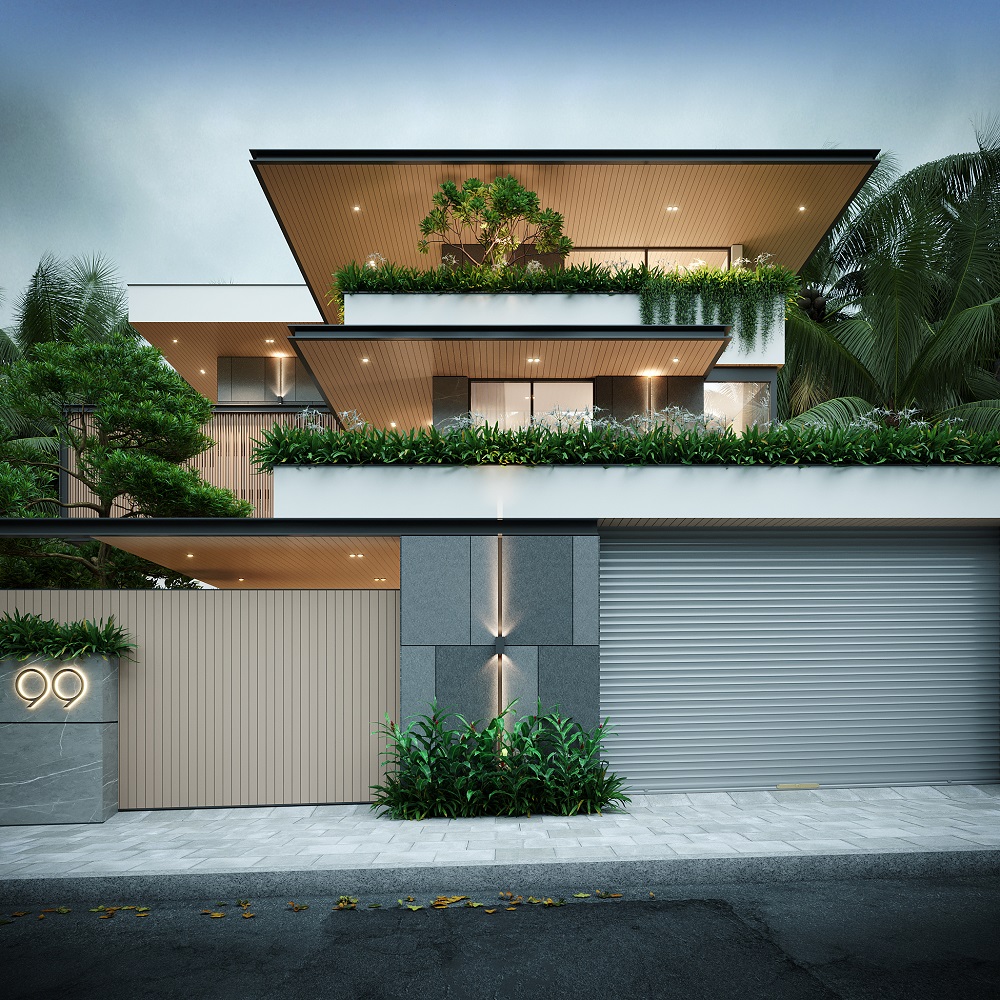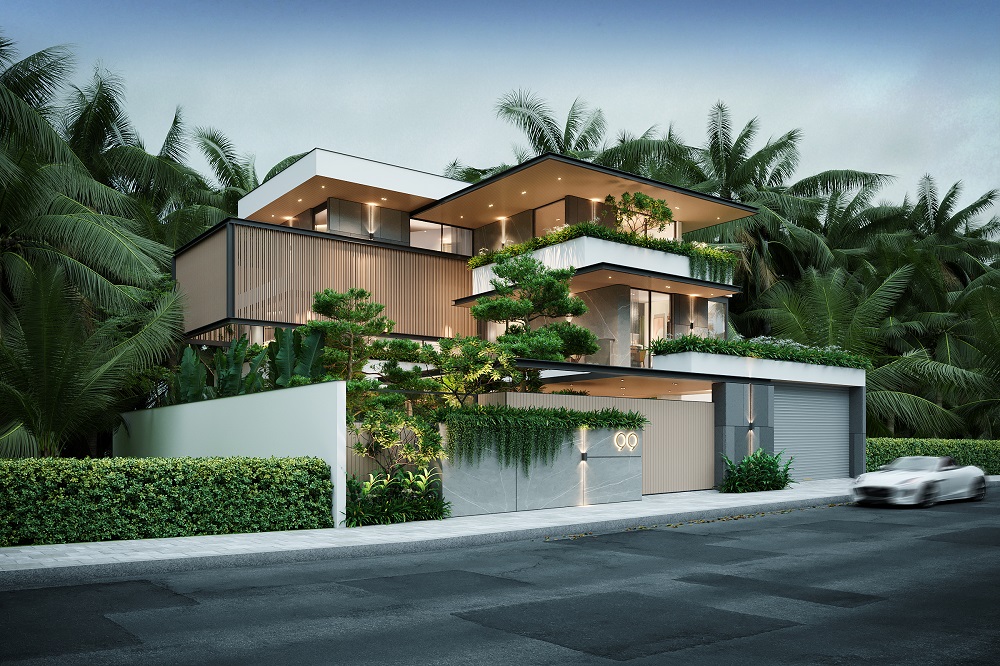 Thiết kế biệt thự mang đến sự đổi mới trong kiến trúc, với sự kết hợp tinh tế giữa lam gỗ, đá và cây xanh. Các tầng lớp kiến trúc không chỉ tạo nên vẻ đẹp nghệ thuật mà còn tận dụng ánh sáng tự nhiên cùng không gian xanh xung quanh.