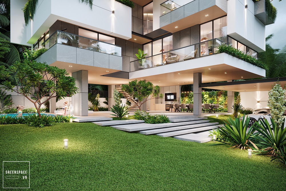 Biệt thự xanh không chỉ có cảnh quan xanh tươi, mà còn tích hợp hệ thống tái tạo năng lượng. Các mái xanh, tường cây và hồ cá kết hợp tạo nên không gian sống không chỉ đẹp mắt mà còn thân thiện với môi trường.