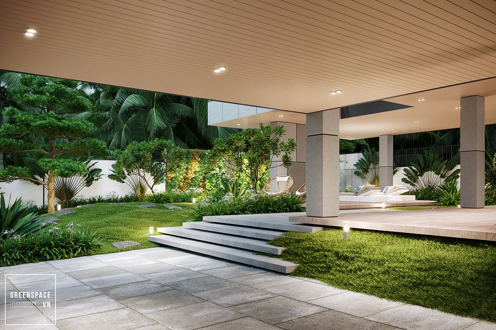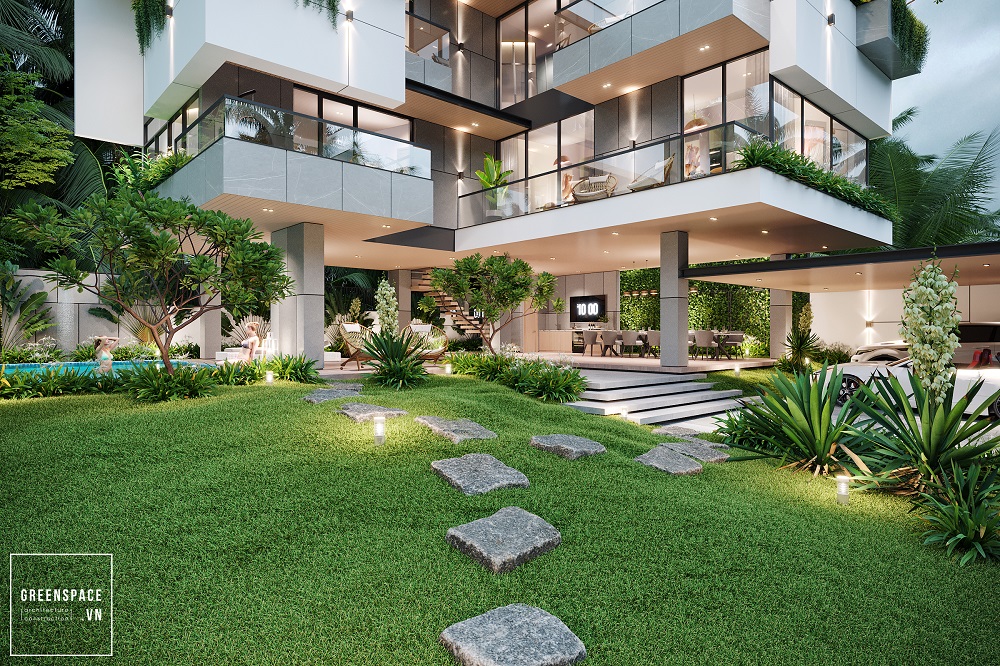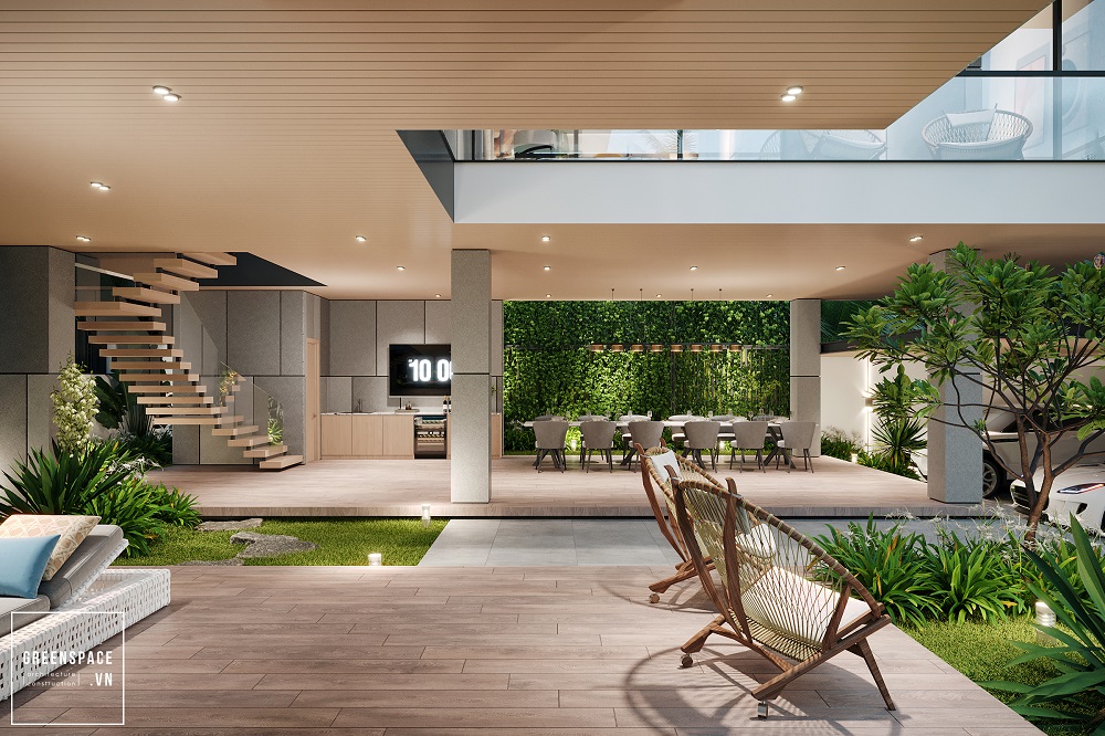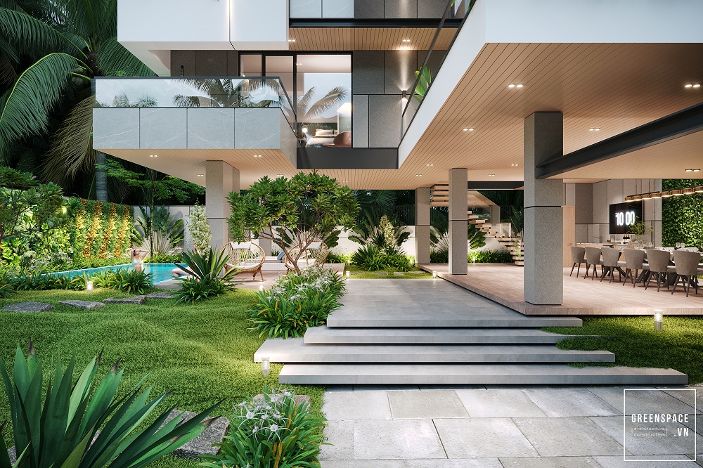 Không chỉ dừng lại ở việc tạo nên hình ảnh nổi bật từ bên ngoài, thiết kế còn chú trọng đến việc tối ưu hóa không gian xanh. Khu vườn được bố trí hài hòa, tạo nên một không gian sống gần gũi với thiên nhiên mà vẫn giữ được vẻ đẳng cấp và hiện đại.