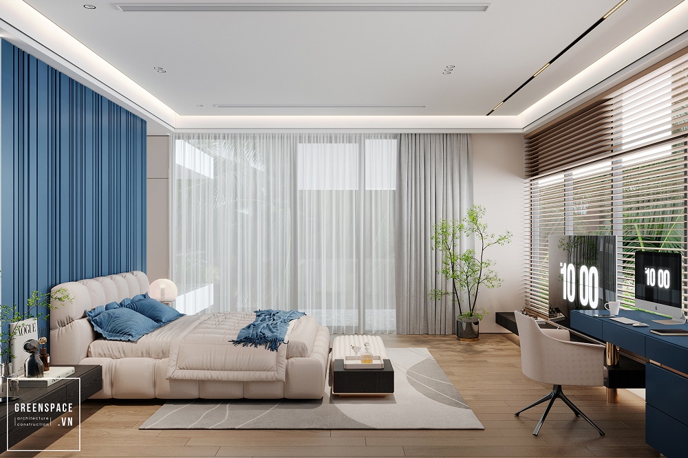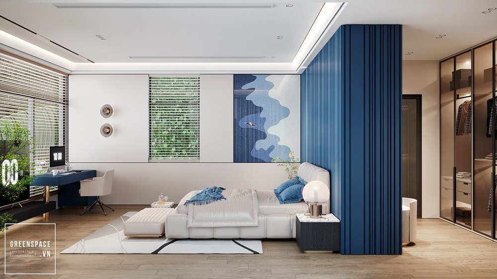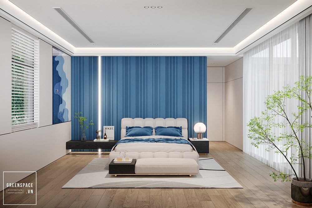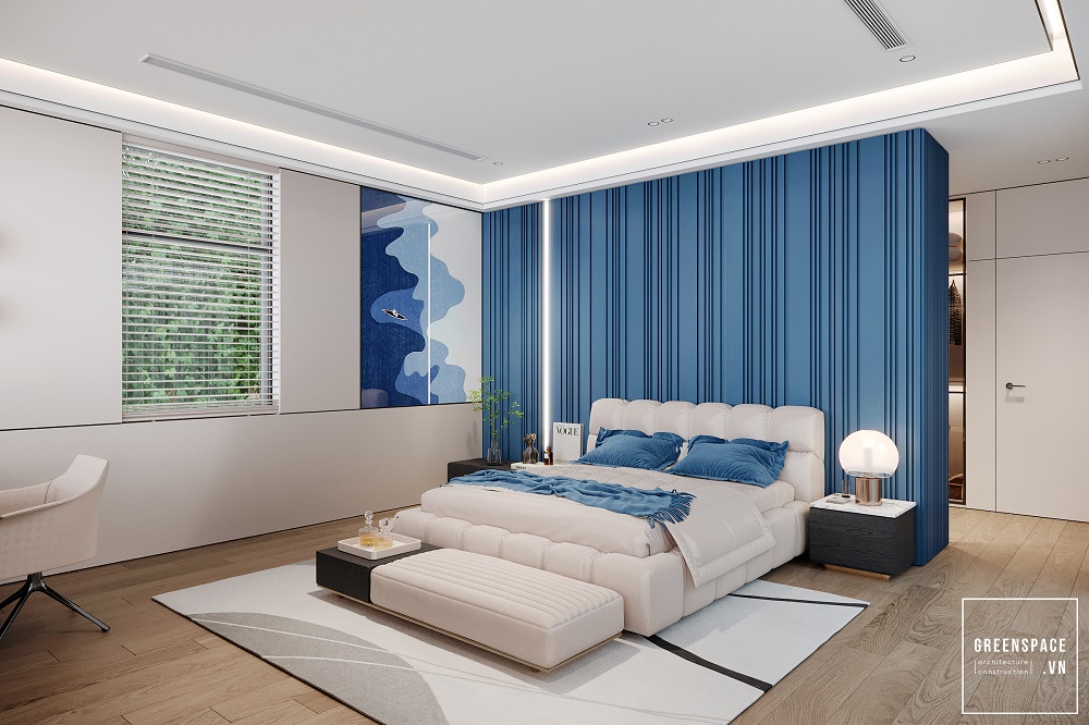Phòng ngủ master, nơi nghỉ ngơi của gia chủ được Không Gian Xanh thiết kế trau chuốt với điểm nhấn màu xanh lam hiện đại. Sự cá tính, năng lượng trẻ trung của gia chủ chính là nguồn cảm hứng chính cho thiết kế Lam House.