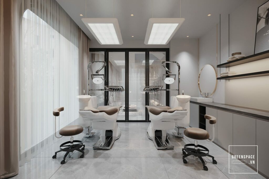 Hệ thống ánh sáng chủ yếu là ánh sáng nhân tạo. Hệ thống đèn les và đèn trang trí âm trân là nguồn ánh sáng chính phòng khám. Không Gian Xanh chọn vật liệu kính cường lực làm cửa ra vào. Chất liệu có độ trong mang lại vẻ đẹp hiện đại và sang trọng cho phòng khám.