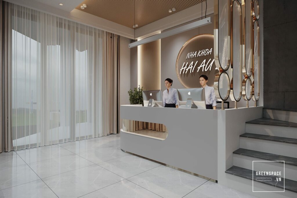 Sảnh đón có hệ thống quầy lễ tân nhỏ gọn để khách hàng chờ khám. Logo tên phòng khám được thiết kế nổi bật với hình ảnh quảng cáo tạo điểm nhấn thu hút.