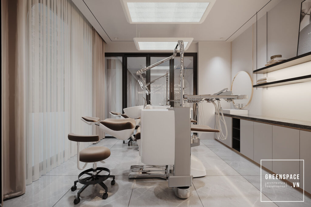 Tầng 1 kết hợp kinh doanh phòng khám nha khoa. Thiết kế nơi làm việc đảm bảo tính chuyên môn và sang trọng, còn không gian sinh hoạt tiện nghi và hiện đại. Phòng khám chỉnh chu, gọn gàng, tăng sự tin tưởng và ấn tượng từ khách hàng.