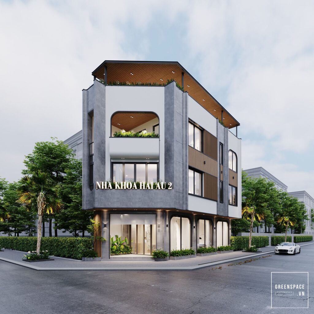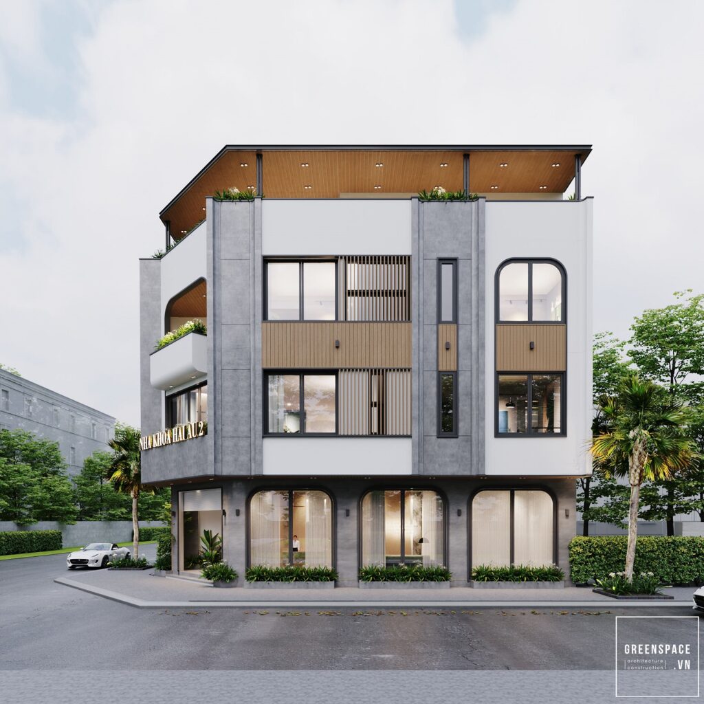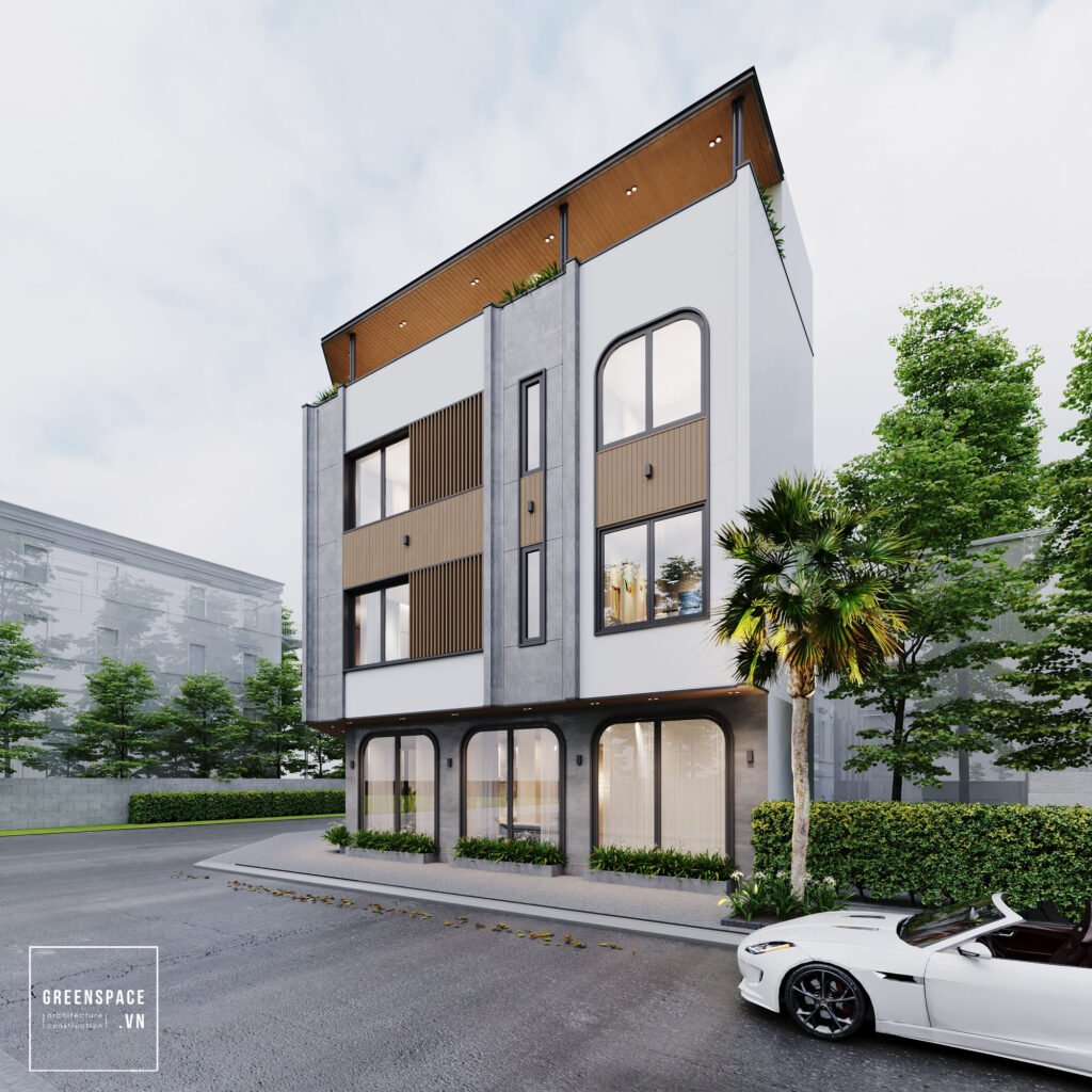 Phương án thiết kế hiện đại và bên cạnh đó kết hợp những đường cong ở các vị trí mái vòm cửa các vị trí bồn hoa… để làm mềm mại hài hòa hơn về khối cũng như tăng độ thẩm mỹ của công trình. Bên cạnh đó team cũng đề xuất điểm tô thêm cho công trình sơn hiệu ứng nhấn để tạo sự tương phản và tăng chiều sâu cho các khối của công trình, việc sử dụng sơn hiệu ứng cũng làm công trình nổi bật và đặc biệt hơn.