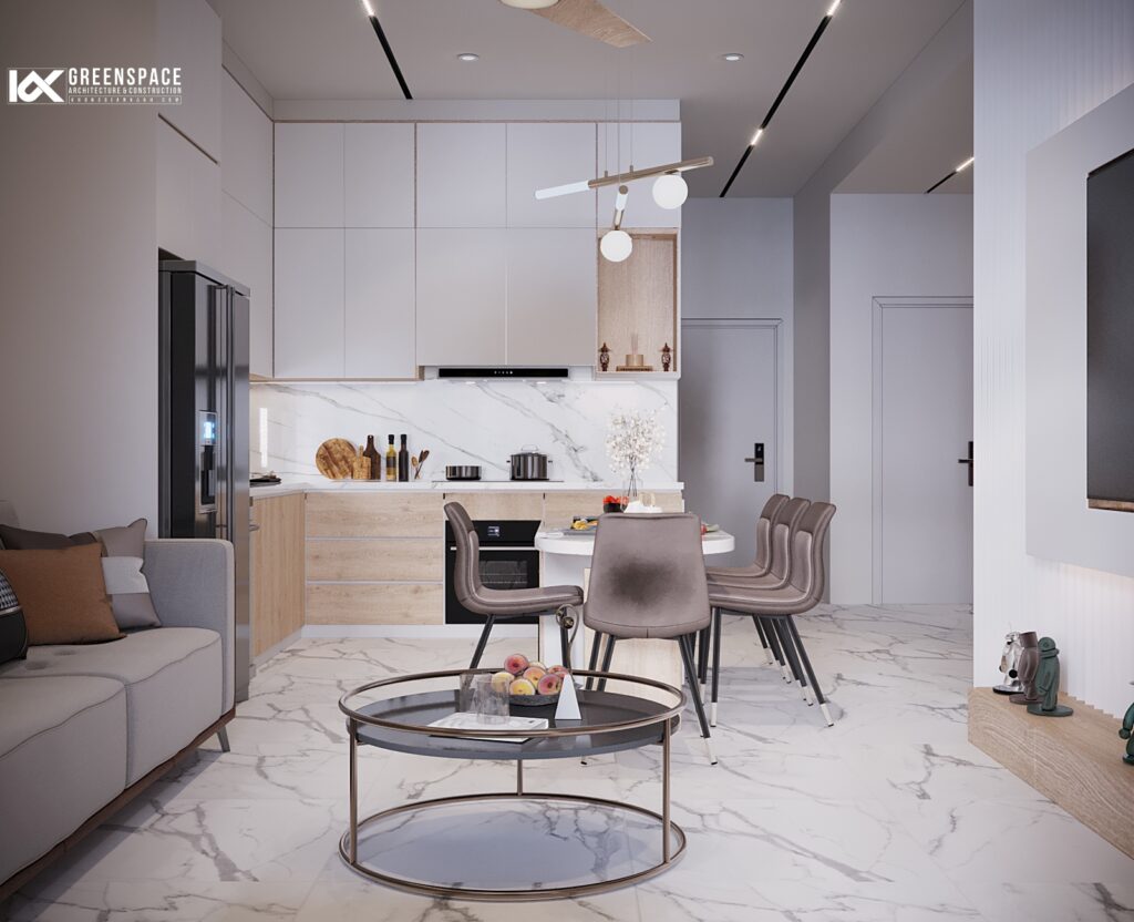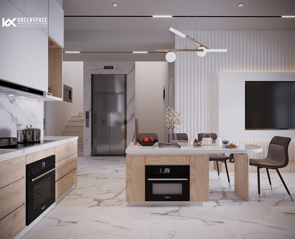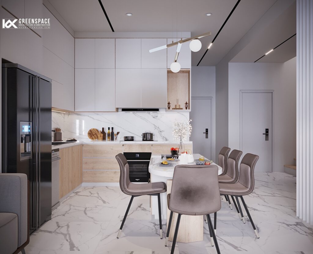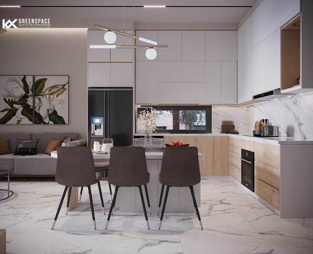 Không gian khách bếp của dự án biệt thự hiện đại này tỏa sáng với gam màu xám nhạt thanh lịch. Phòng khách được trang bị sofa bọc vải cao cấp màu xám, kết hợp với bàn trà kính tạo nên vẻ đẹp tinh tế. Nhà bếp mở kết nối mượt mà với phòng khách, với các tủ bếp màu gỗ nhạt, cùng bề mặt đá trắng tạo điểm nhấn. Ánh sáng tự nhiên tràn ngập qua cửa kính lớn, làm nổi bật sự hiện đại và thoáng đãng. Những chi tiết trang trí đơn giản nhưng tinh tế mang đến cảm giác ấm cúng và sang trọng.
