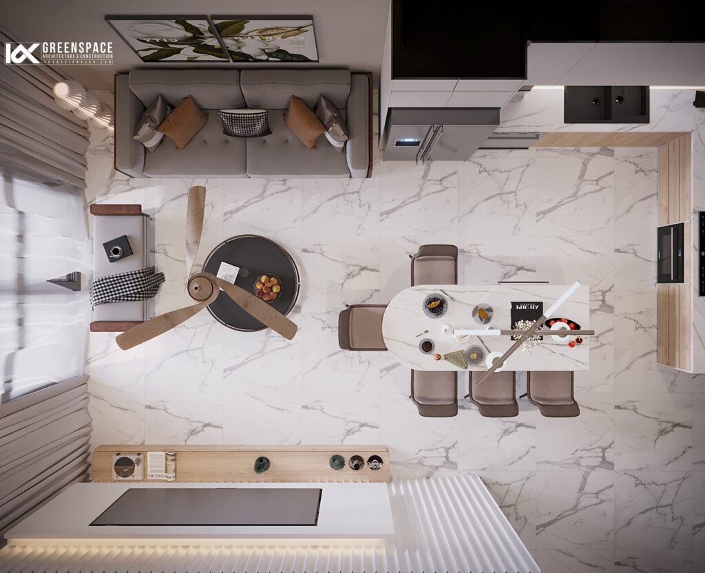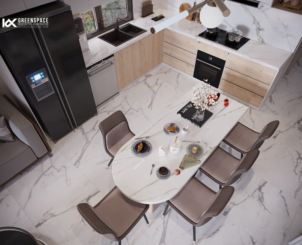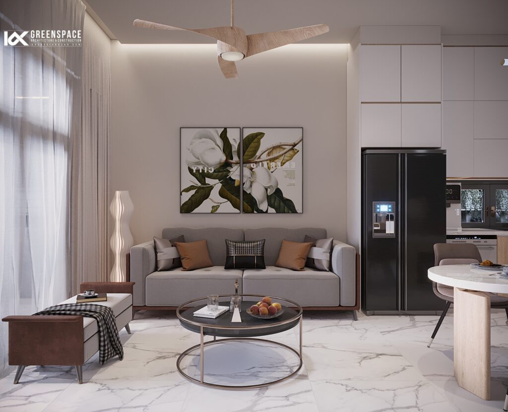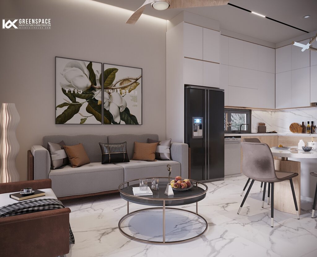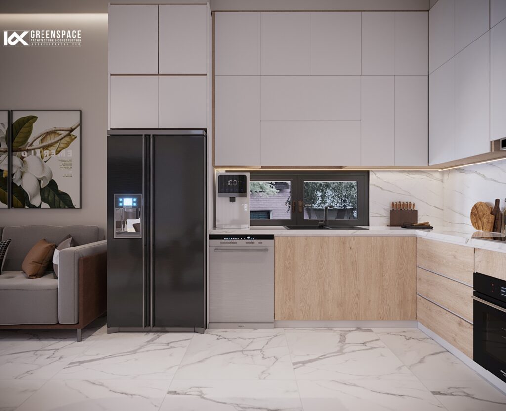Không gian khách bếp của dự án biệt thự hiện đại này tỏa sáng với gam màu xám nhạt thanh lịch. Phòng khách được trang bị sofa bọc vải cao cấp màu xám, kết hợp với bàn trà kính tạo nên vẻ đẹp tinh tế. Nhà bếp mở kết nối mượt mà với phòng khách, với các tủ bếp màu gỗ nhạt, cùng bề mặt đá trắng tạo điểm nhấn. Ánh sáng tự nhiên tràn ngập qua cửa kính lớn, làm nổi bật sự hiện đại và thoáng đãng. Những chi tiết trang trí đơn giản nhưng tinh tế mang đến cảm giác ấm cúng và sang trọng.