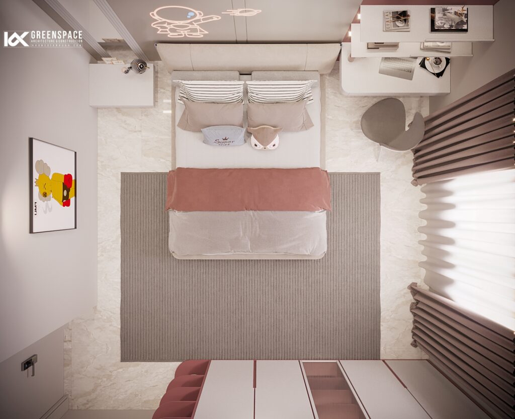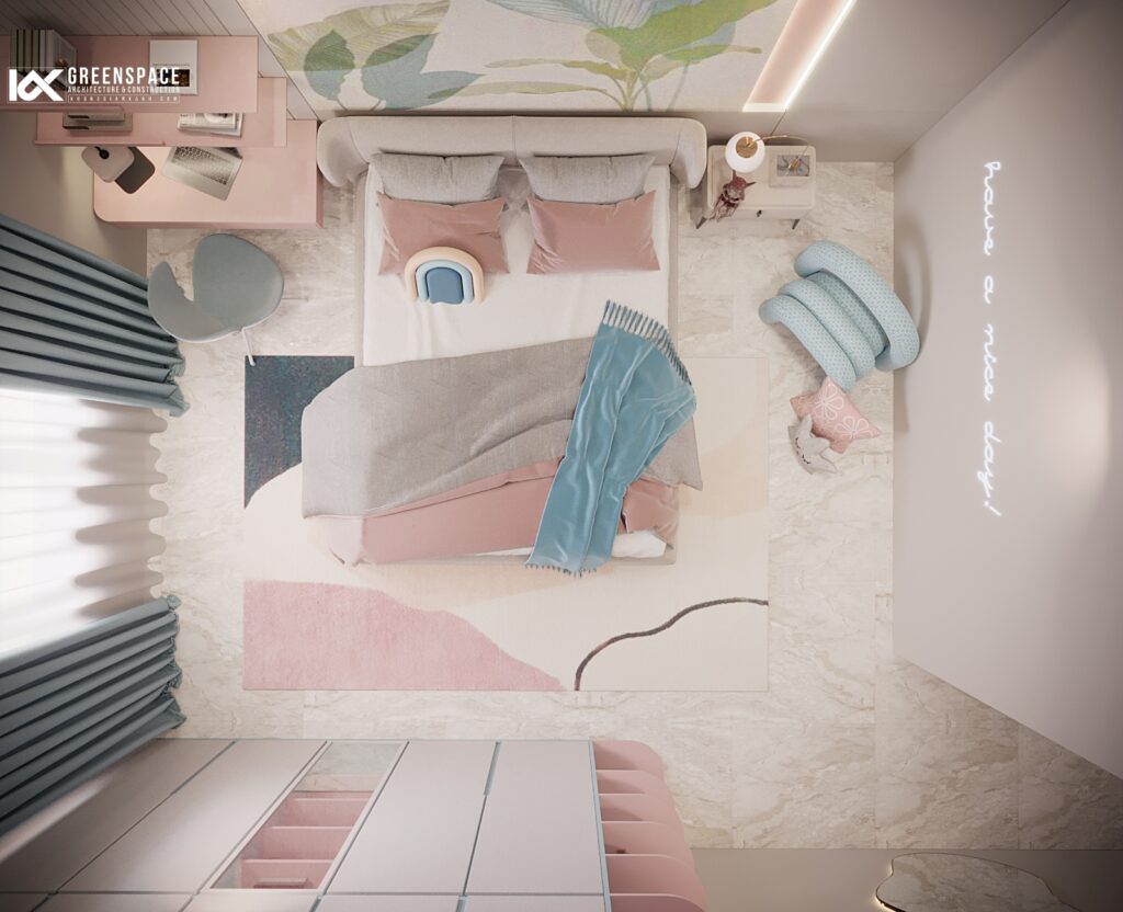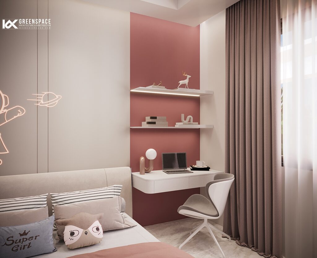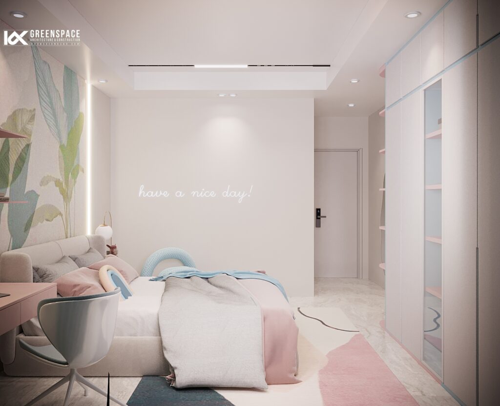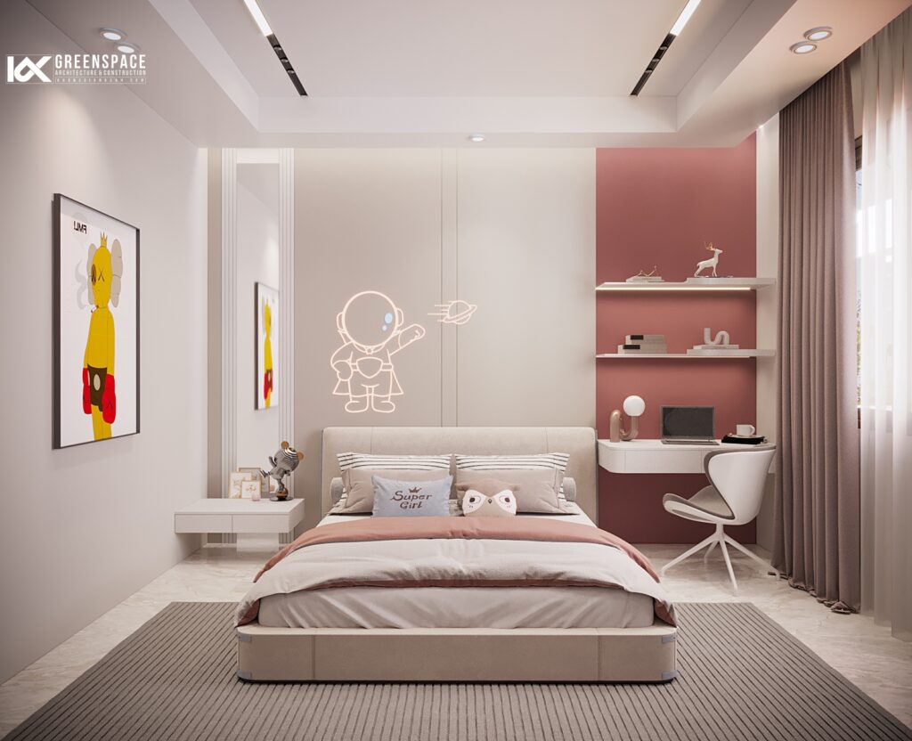 Nội thất phòng ngủ thường với gam màu xám nhạt chủ đạo được thiết kế riêng biệt cho từng thành viên. Phòng phối màu hồng dành cho con gái, với giường phủ chăn ga hồng, kèm theo các họa tiết trang trí trên tường dễ thương và rèm cửa màu hồng phấn tạo nên không gian ngọt ngào và tươi vui.