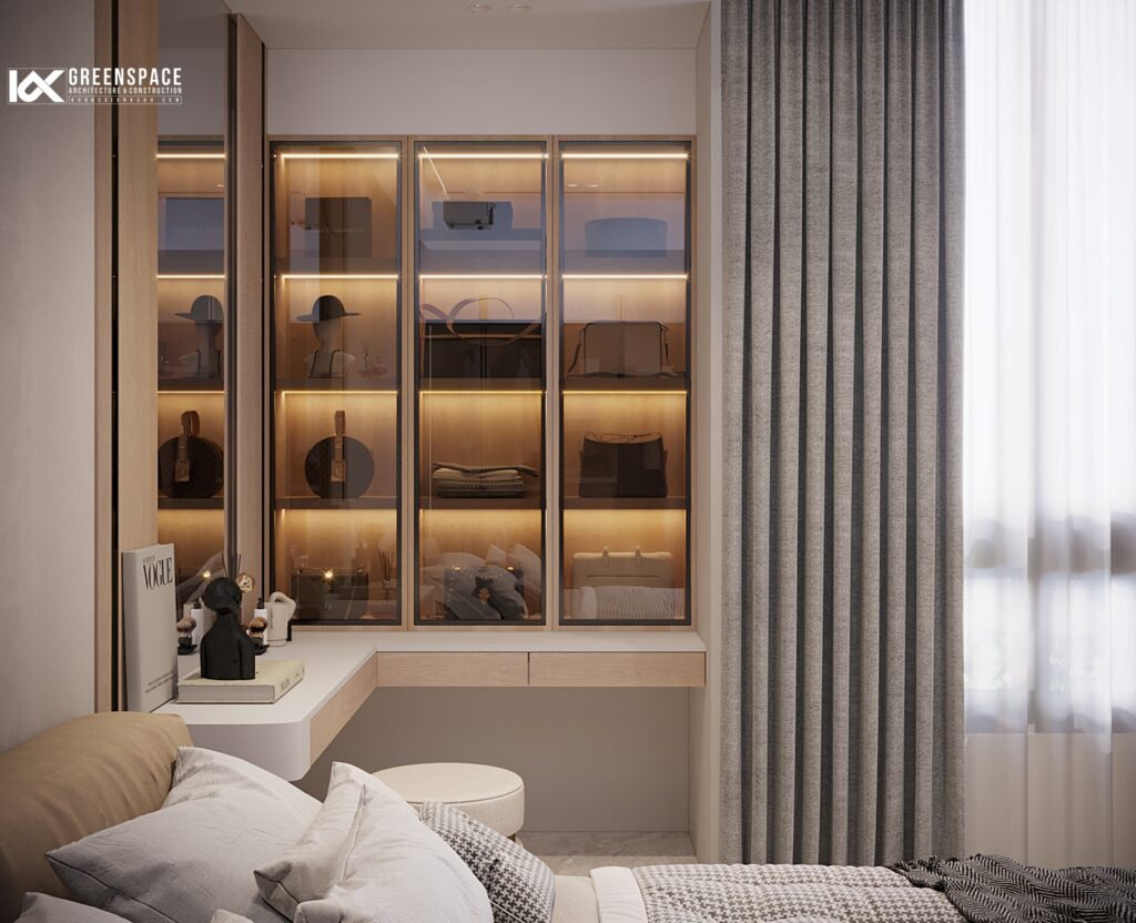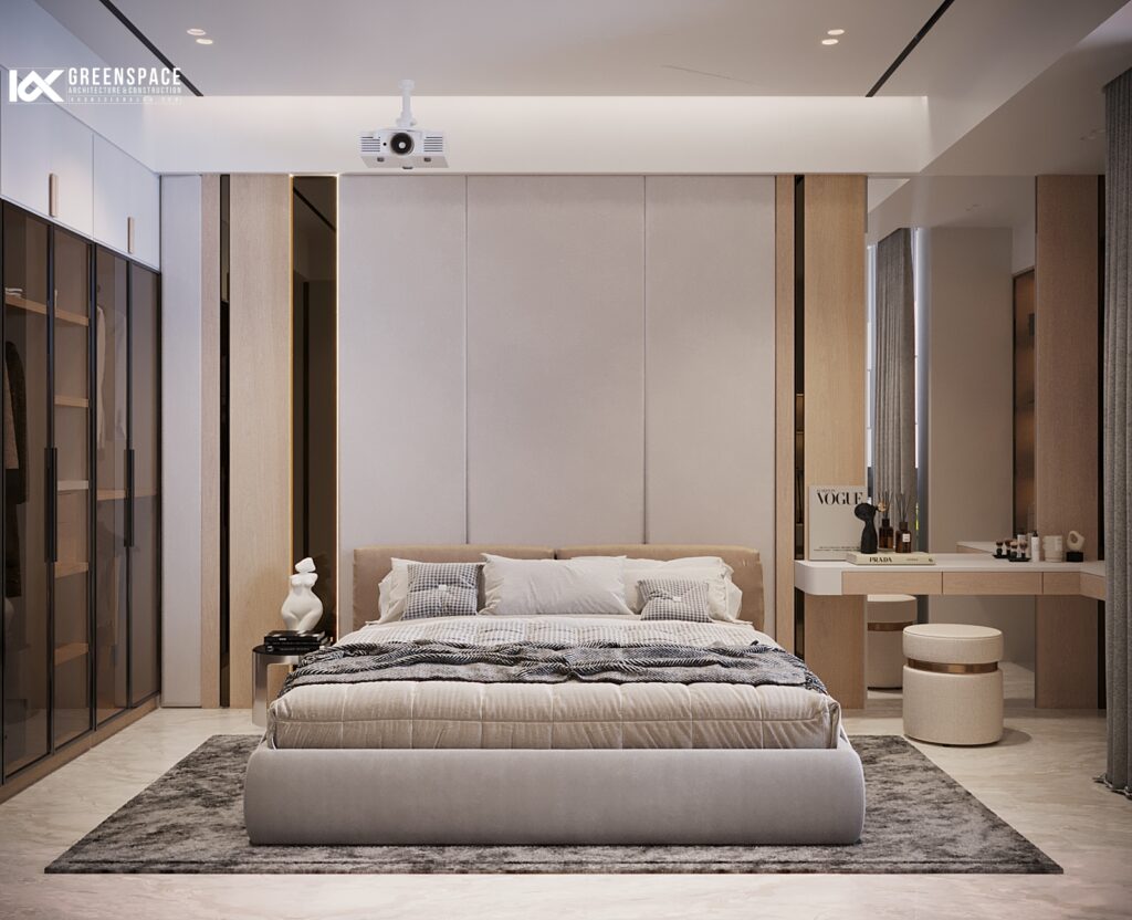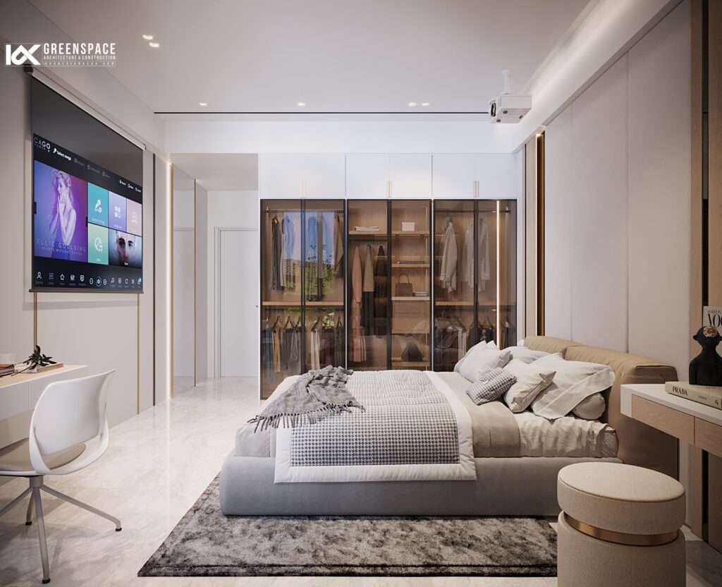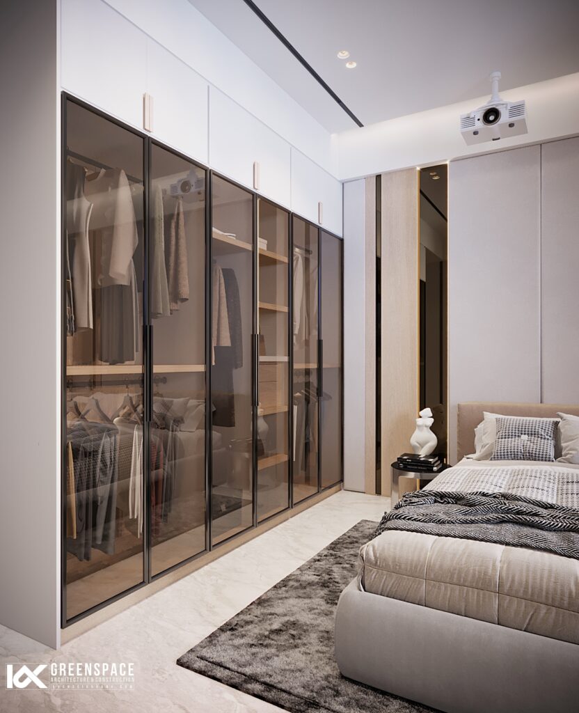 Phòng ngủ master được KTS thiết kế với gam màu xám nhạt chủ đạo mang đến cảm giác thư thái và sang trọng. Màn hình chiếu treo tường đối diện giường, mang lại tiện nghi giải trí. Tủ chứa đồ với mặt kính trong suốt, gọn gàng, giúp phòng luôn ngăn nắp và hiện đại. Bàn trang điểm thiết kế thanh lịch, tích hợp gương lớn và ngăn kéo tiện dụng. Ánh sáng tự nhiên từ ô cửa sổ lớn, giúp không gian nghỉ ngơi luôn sáng sủa và thoáng đãng.