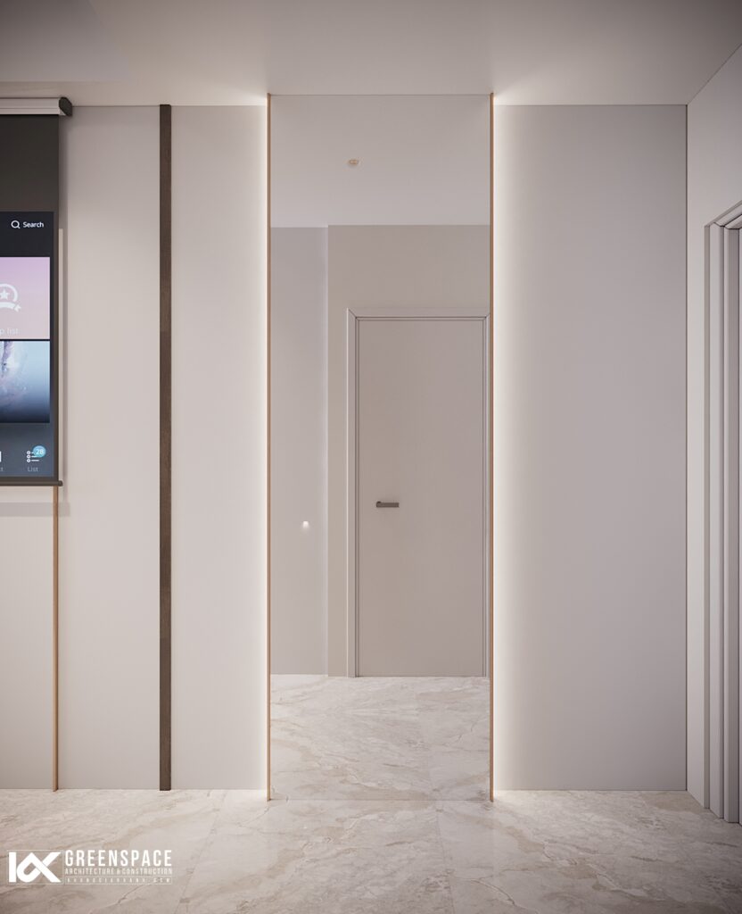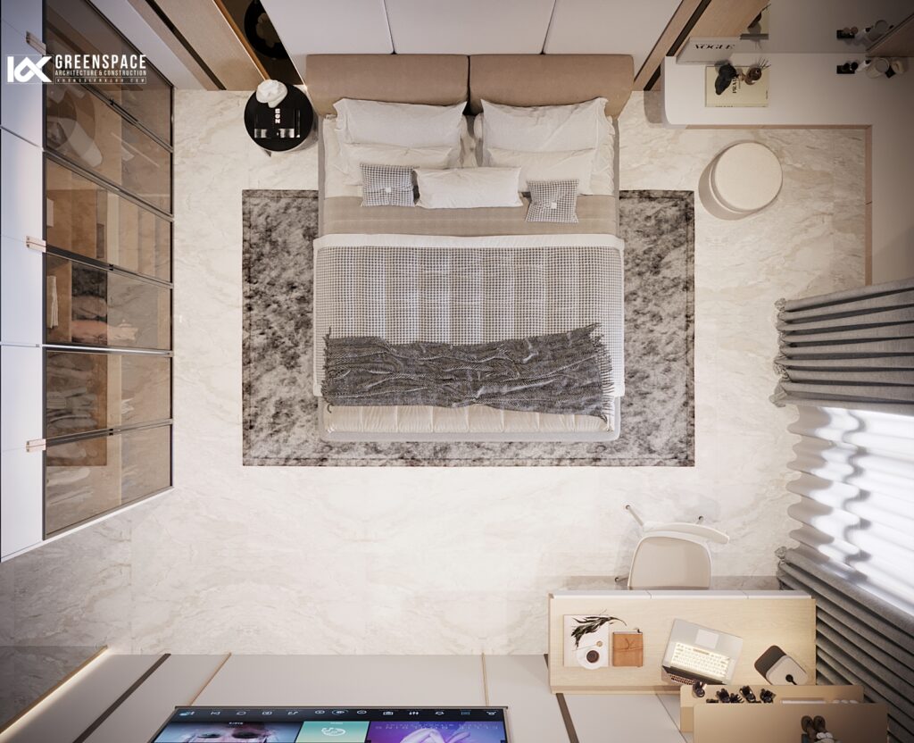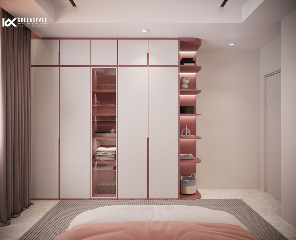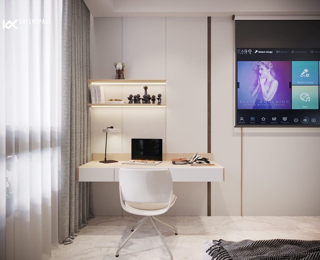 Phòng ngủ master được KTS thiết kế với gam màu xám nhạt chủ đạo mang đến cảm giác thư thái và sang trọng. Màn hình chiếu treo tường đối diện giường, mang lại tiện nghi giải trí. Tủ chứa đồ với mặt kính trong suốt, gọn gàng, giúp phòng luôn ngăn nắp và hiện đại. Bàn trang điểm thiết kế thanh lịch, tích hợp gương lớn và ngăn kéo tiện dụng. Ánh sáng tự nhiên từ ô cửa sổ lớn, giúp không gian nghỉ ngơi luôn sáng sủa và thoáng đãng.