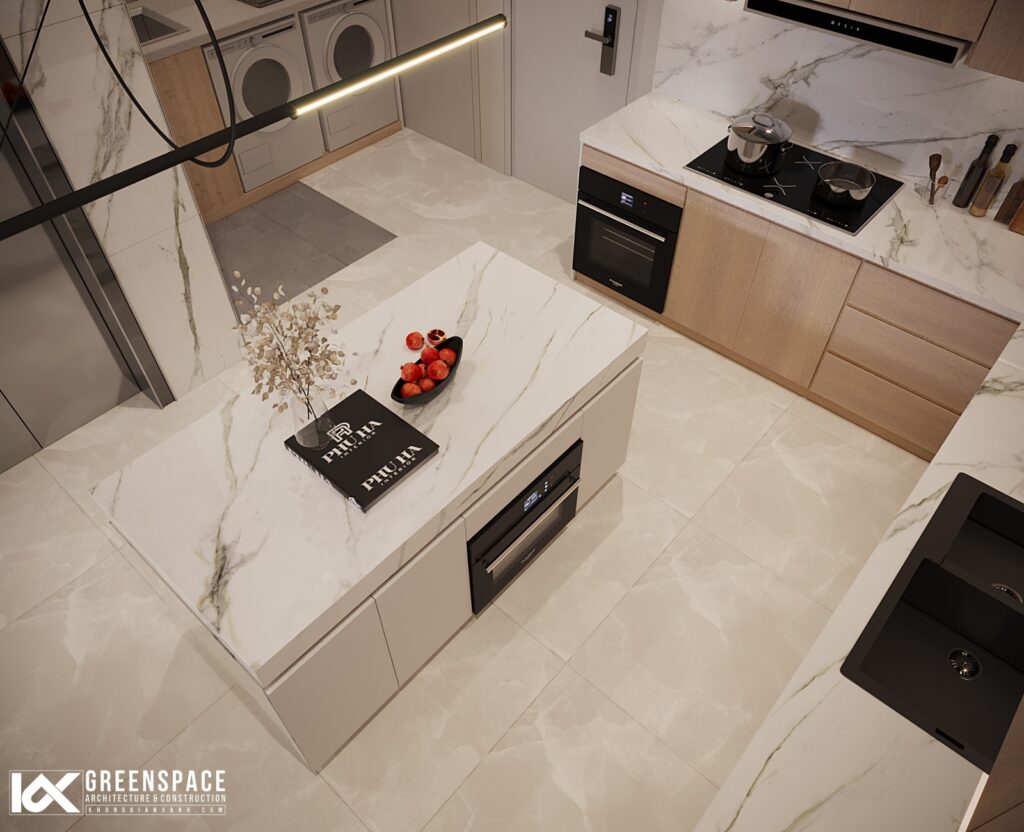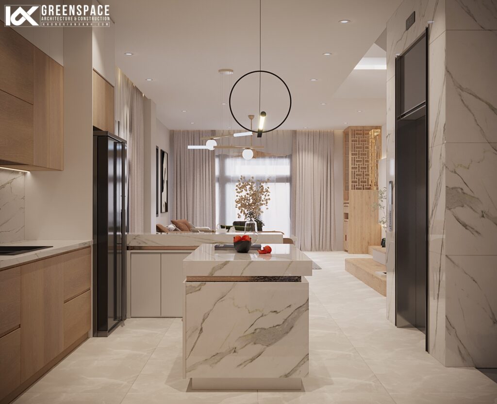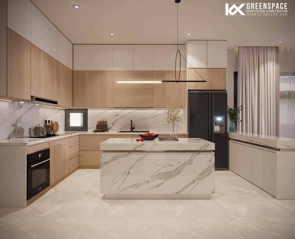 Gia đình khá đông thành viên nên nhu cầu sử dụng bếp cũng cần phải đầy đủ tiện nghi và rộng rãi. Với thiết kế hiện đại, KTS của chúng tôi đã chọn lựa những giải pháp tối ưu để làm hài lòng khách hàng. Một trong những ý tưởng được triển khai là tận dụng ánh sáng tự nhiên và không gian mở giữa bếp và phòng khách. Điều này tạo sự thông thoáng. Giúp dễ dàng giao tiếp giữa các thành viên trong gia đình khi chuẩn bị và thưởng thức bữa ăn.