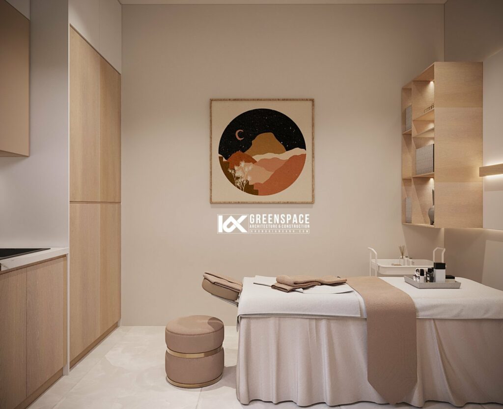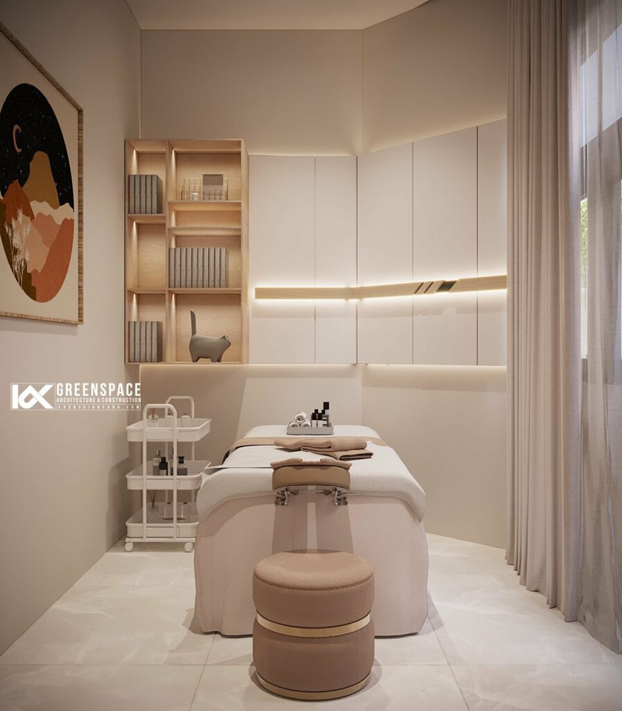 Không gian spa không chỉ mang đến cảm giác thư giãn mà còn giúp khách hàng tìm lại sự cân bằng trong cuộc sống hối hả hiện nay. Bằng cách kết hợp giữa các gam màu trung tính nhẹ nhàng và các gam màu ấm như nâu nhạt, không gian được tạo ra trở nên ấm áp và thân thiện. Bên cạnh đó, các âm thanh êm ái và hương thơm tự nhiên từ các tinh dầu cũng đóng vai trò quan trọng trong việc tạo nên một trải nghiệm spa toàn diện và thư giãn.