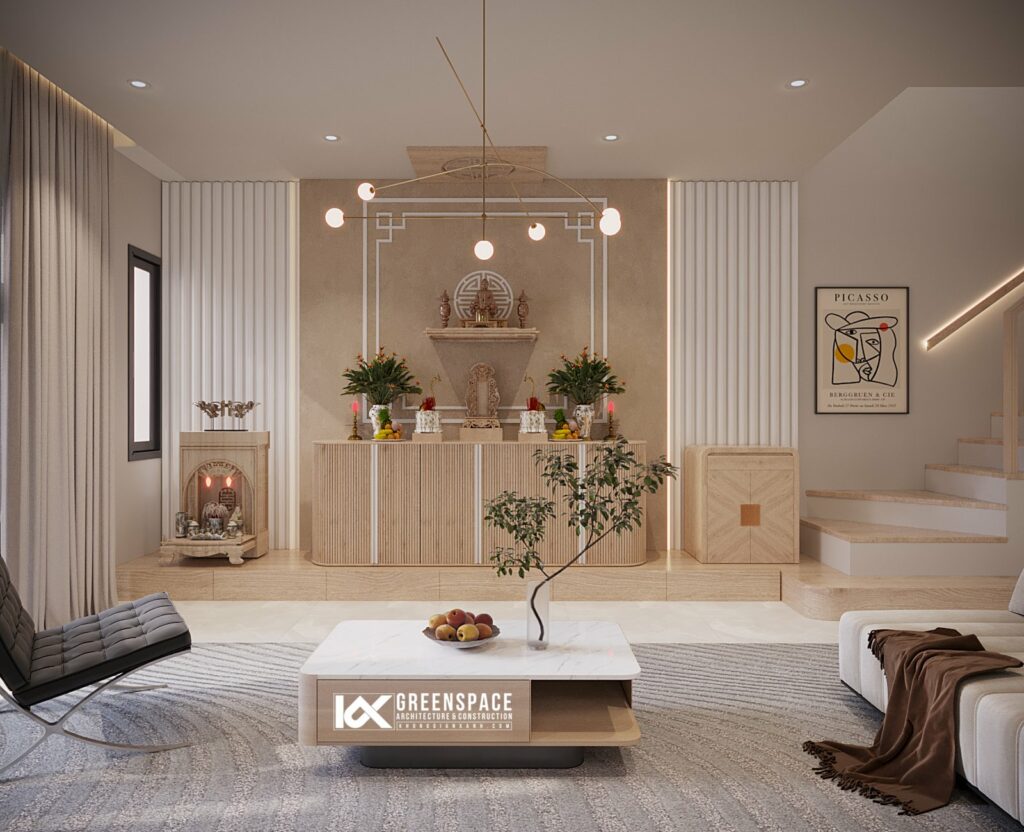 Gia chủ là người theo đạo. Chị mong muốn không gian thờ cúng trở thành điểm nhấn trang trọng và đáng chú ý nhất trong nhà. Để đáp ứng điều này, KTS đã dành riêng một phần tường lớn trong phòng khách làm nơi thờ cúng. Thiết kế này không chỉ tạo ra một không gian linh thiêng để thực hành các nghi lễ tôn giáo. Nó còn mang đến sự tinh tế và sang trọng cho không gian chung của căn nhà. Mảnh tường này được chăm chút tỉ mỉ với các chi tiết trang trí và đồ nội thất phù hợp. Tất cả tạo nên một không gian thờ phụng đáng kính trong lòng gia đình và khách đến thăm.