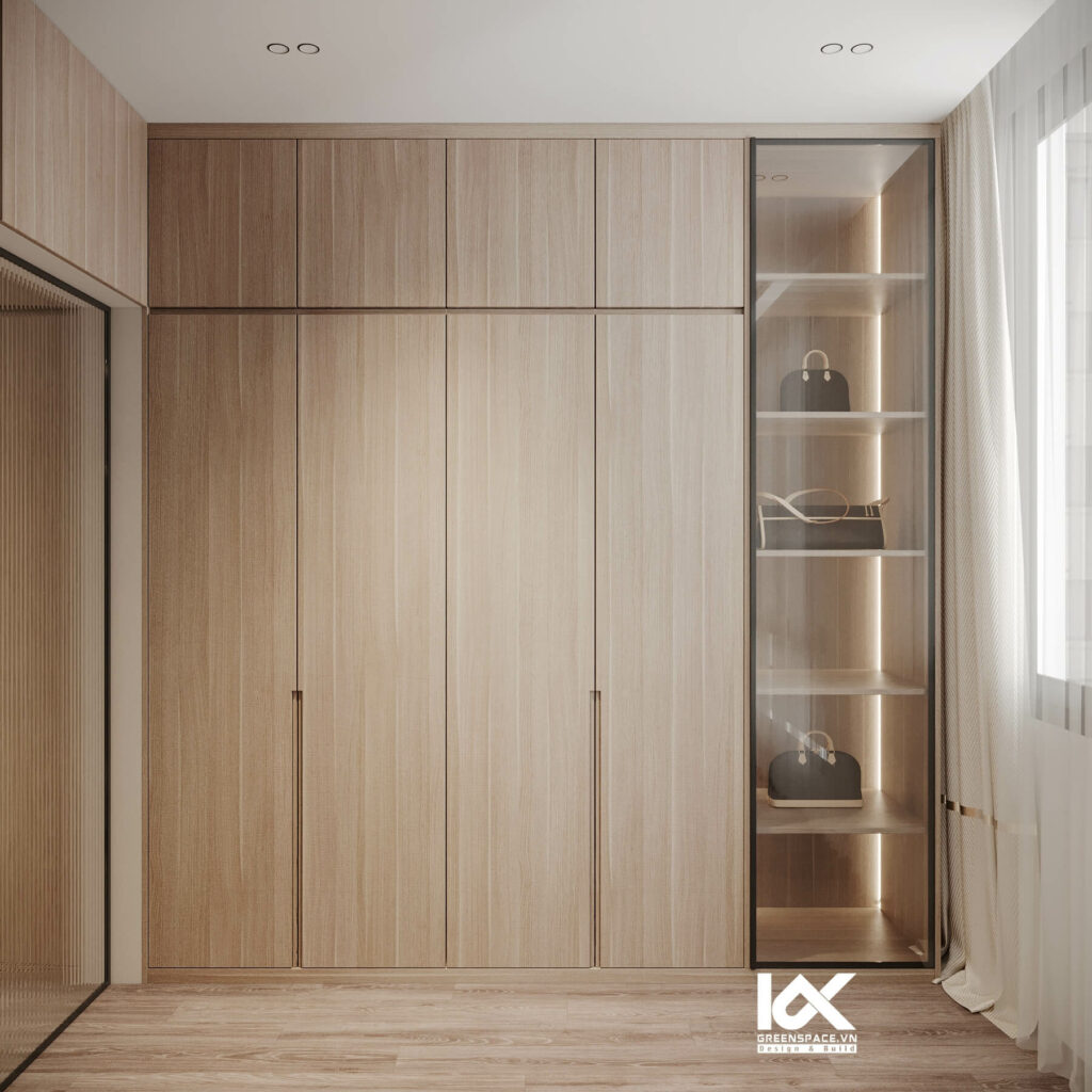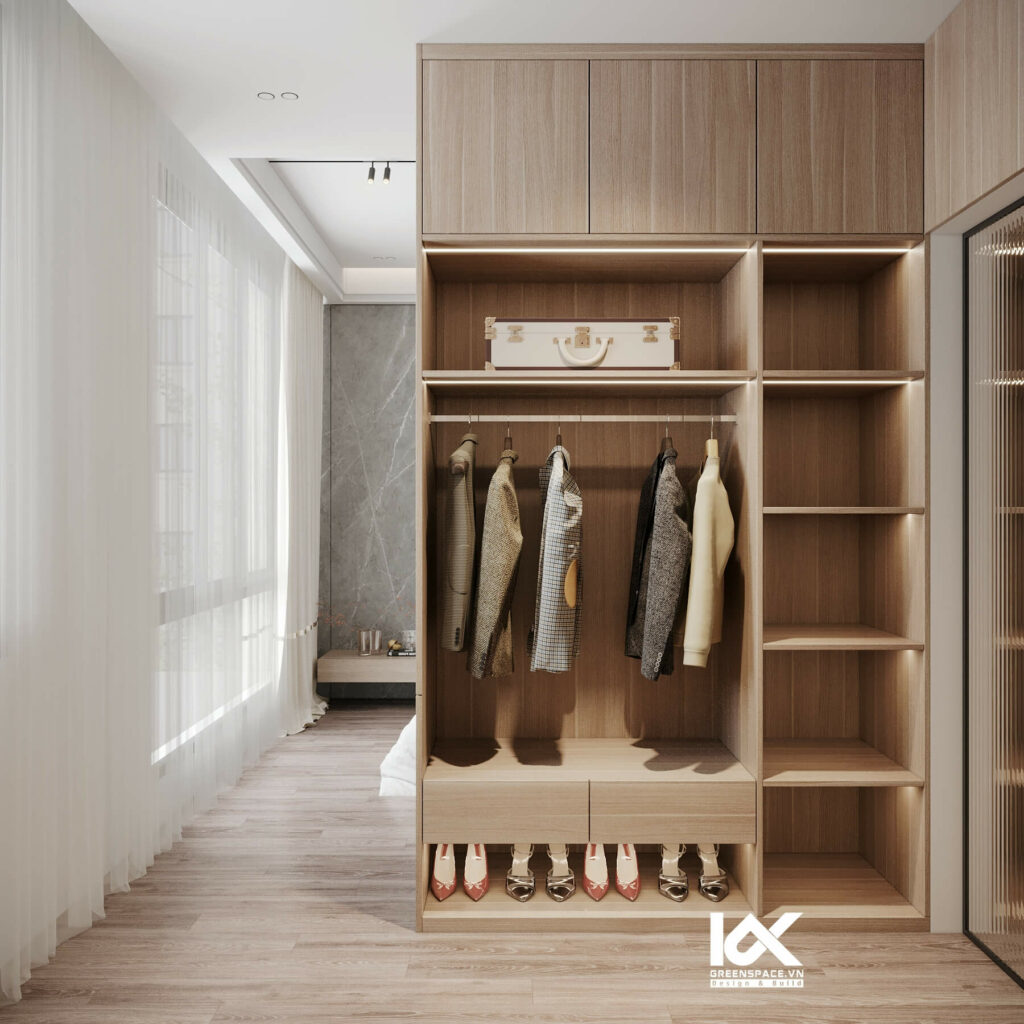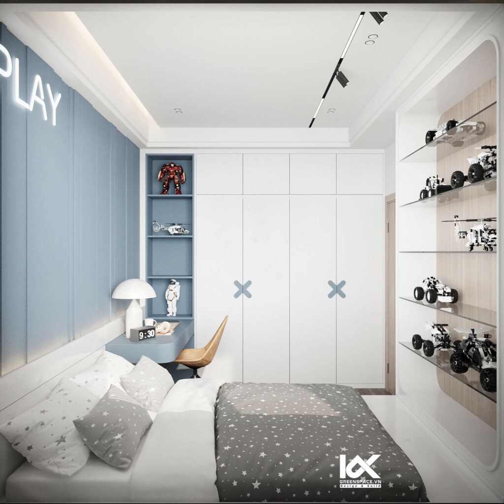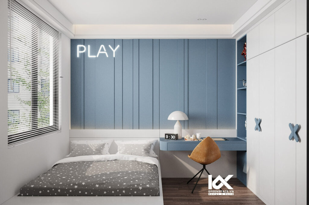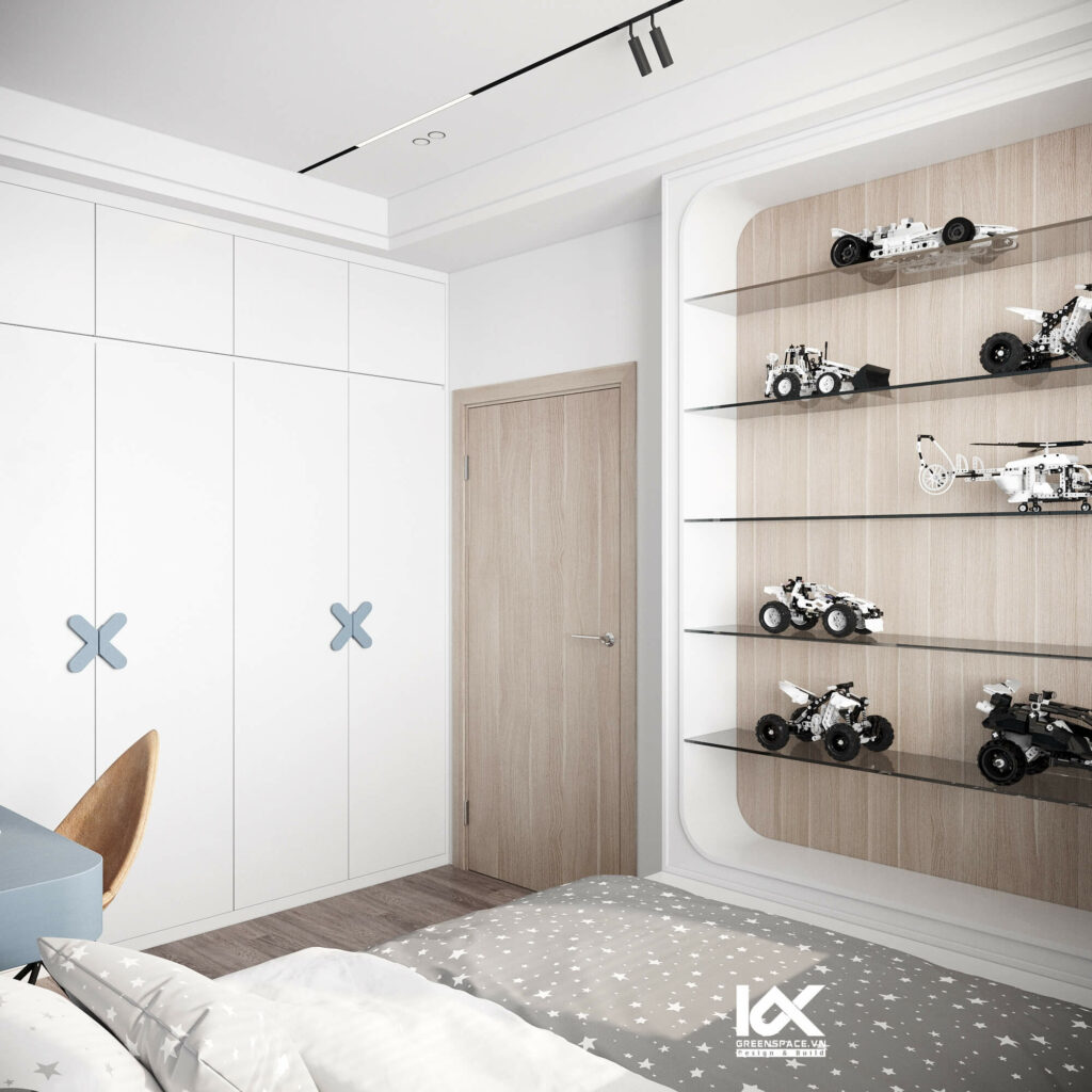 Phòng ngủ cho con trẻ được thiết kế với đường nét mềm mại hơn. Chi tiết nội thất cũng được chú trọng lành mạnh, thân thiện với trẻ em như tay nắm cửa ít góc cạnh, kệ tủ đựng đồ chơi có tầm cao trung bình, thuận tiện cho các trẻ sử dụng.