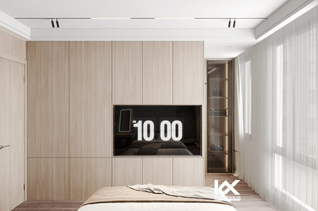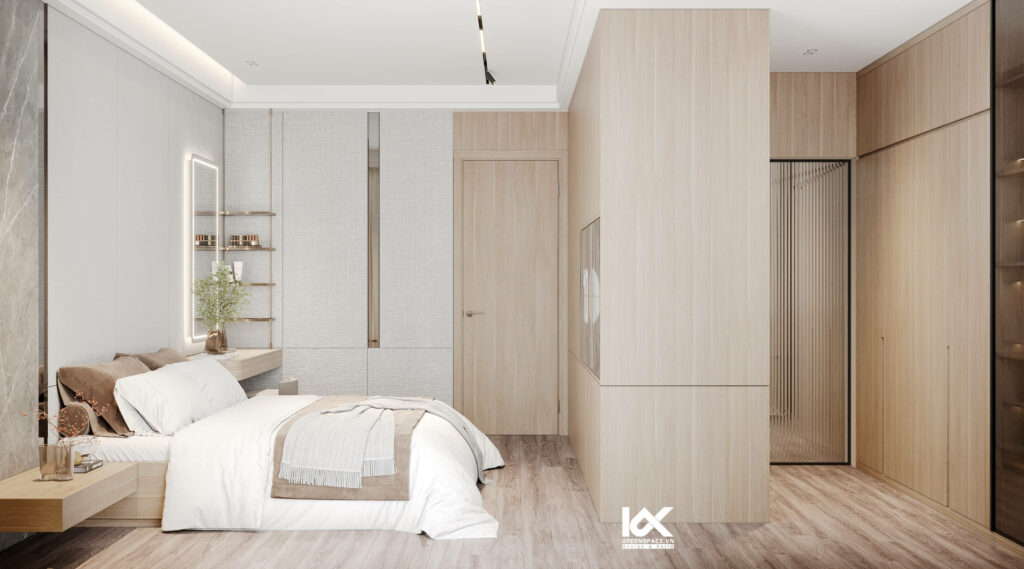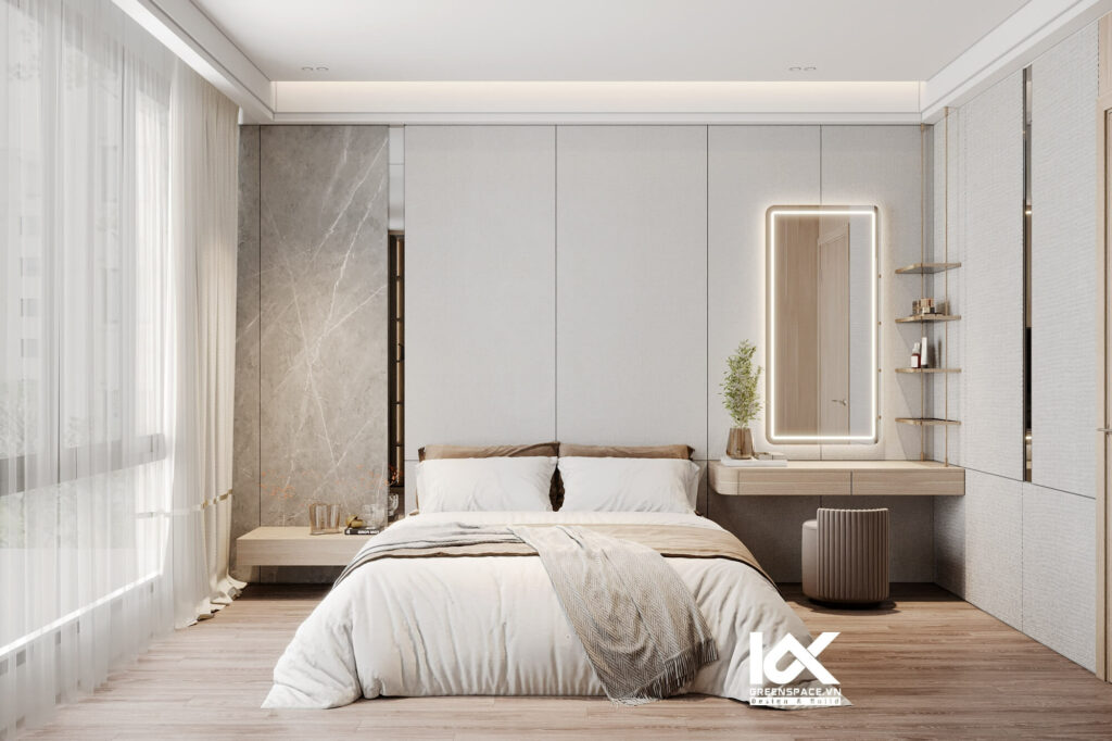 Tiếp nối không gian tầng 2 là phòng ngủ master. Nội thất của căn phòng rất đỗi nhẹ nhàng và thư thái. Gam màu nền nã làm chủ đạo tạo cảm giác dễ chịu. Chiếc giường lớn được đặt ở trung tâm, với bộ chăn ga mềm mại mang lại sự thoải mái tối đa cho người sử dụng.