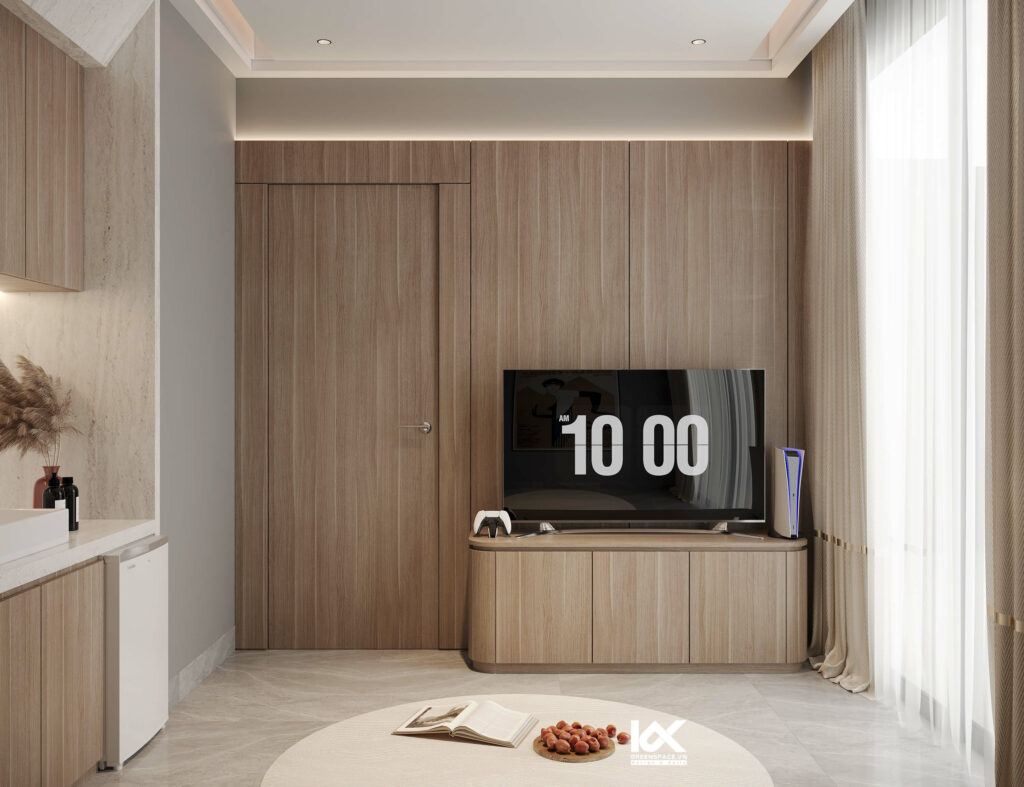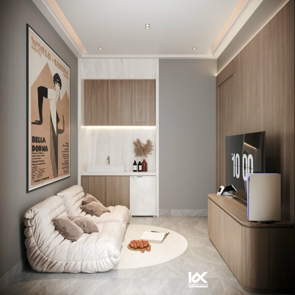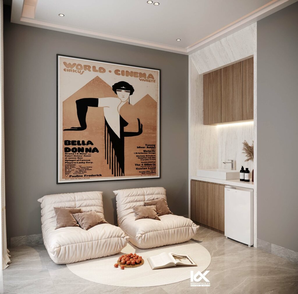 Phòng chơi game là không gian giá trí của gia đình. Tuy nhỏ gọn nhưng đầy đủ tiện nghi. Trong phòng được bố trí một quầy bếp nhỏ, có tủ lạnh mini. Chắc chắn các thành viên có thể sinh hoạt trong phòng thời gian dài mà không cảm thấy ngột ngạt hay bất tiện.