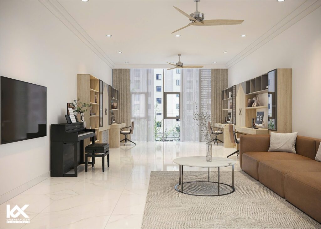 Phòng khách không chỉ là không gian lý tưởng để cả gia đình thư giãn sau những giờ làm việc căng thẳng. Nơi đây còn được tận dụng một cách thông minh để trở thành góc học tập tiện lợi cho các con.