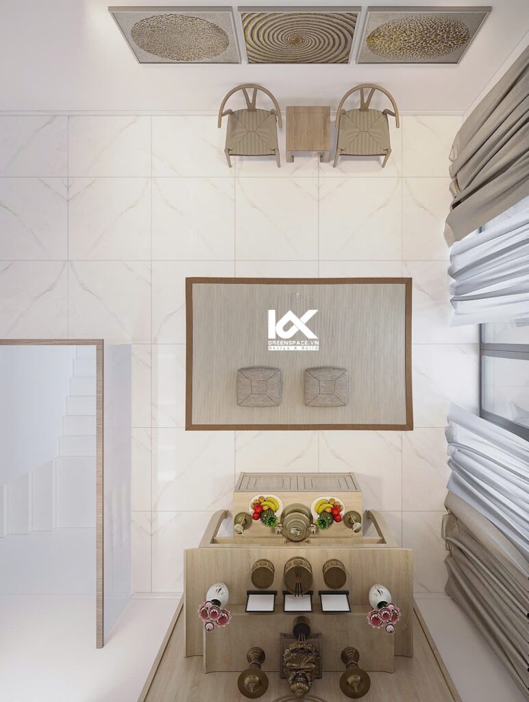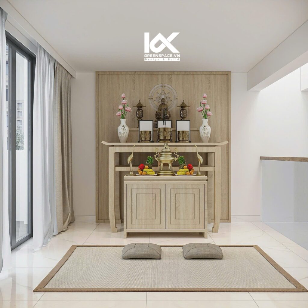 Gia chủ mong muốn nội thất phòng thờ đơn giản nhưng tinh tế. Thể hiện sự trang nghiêm nhưng không gian không được quá nặng nề. Do đó, KGX đã thiết kế nên không gian thờ tụng với những đường nét tối giản, màu sắc nhẹ nhàng kết hợp với các chất liệu gỗ tự nhiên mang lại cảm giác ấm cúng và gần gũi.