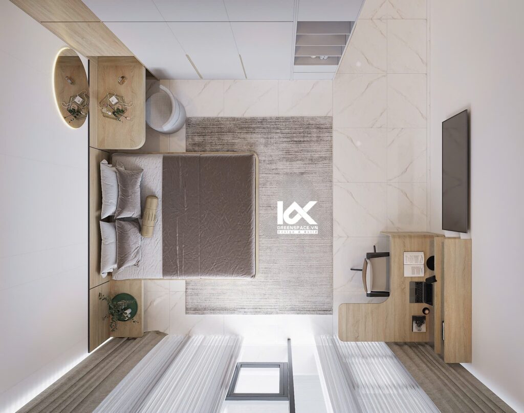 Có tổng cộng 3 phòng ngủ cho mẫu thiết kế nội thất nhà ở Vũng Tàu này. Đầu tiên là phòng ngủ master dành cho vợ chồng gia chủ. Kiến trúc sư của KGX đã tinh tế kết hợp ba tông màu chủ đạo: trắng, nâu nhạt và xám. Nhờ đó, tạo nên một không gian nghỉ ngơi thanh lịch và ấm áp. Màu trắng mang lại sự tươi sáng, thoáng đãng. Trong khi nâu nhạt và xám tạo cảm giác êm dịu, thư giãn, giúp căn phòng thêm phần yên bình.