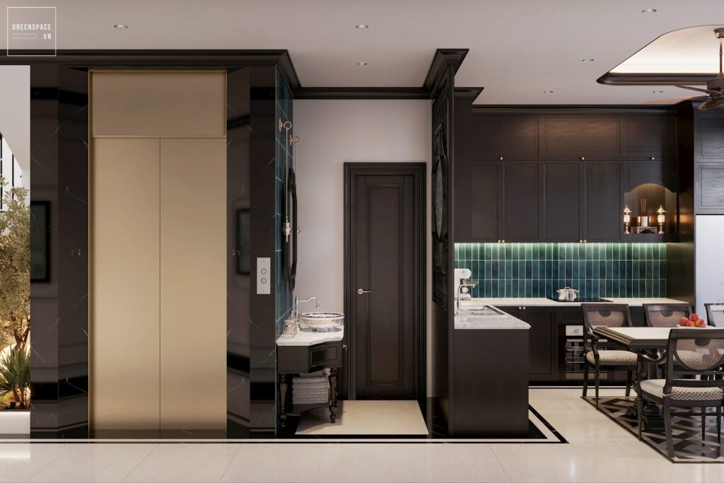 Nối liền với phòng khách là không gian bếp. Khu vực bếp được khai thác triệt để diện tích để tối ưu công năng.