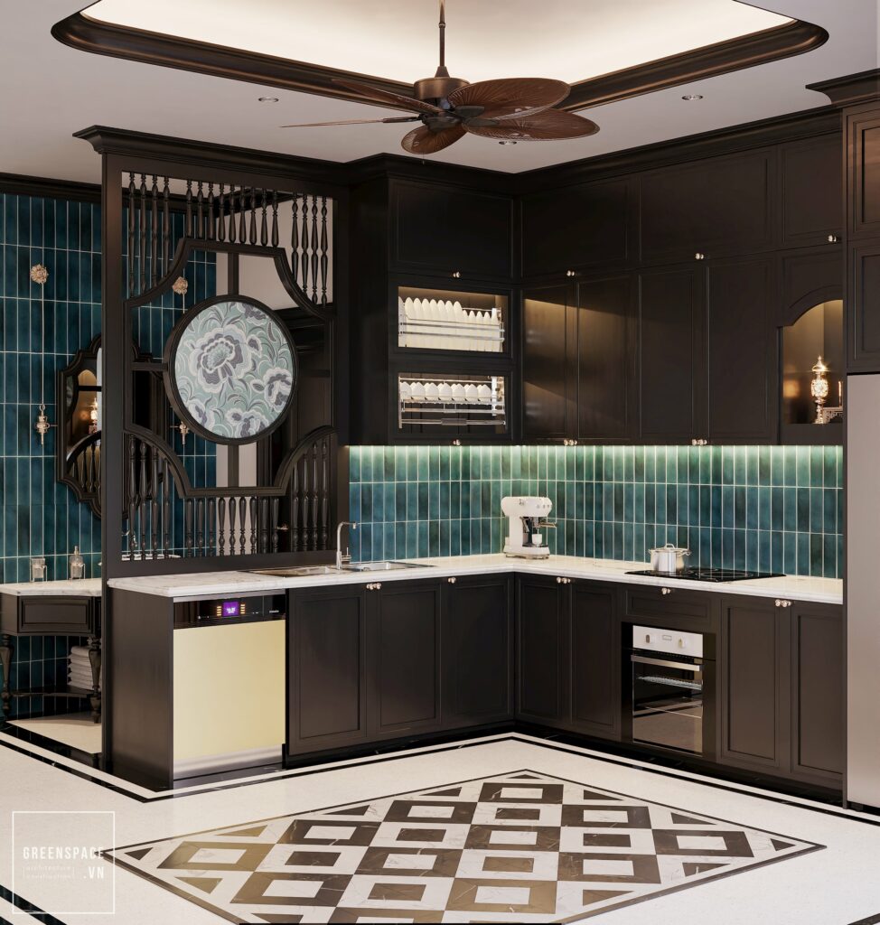 Các ngăn tủ chạm trần giúp tối ưu hóa không gian lưu trữ. Trong khi bếp chữ “L” tạo lối đi rộng rãi, thuận tiện cho việc di chuyển và nấu nướng. Ánh sáng tự nhiên từ cửa sổ lớn chiếu vào, làm không gian bếp trở nên sáng sủa và thoáng đãng.