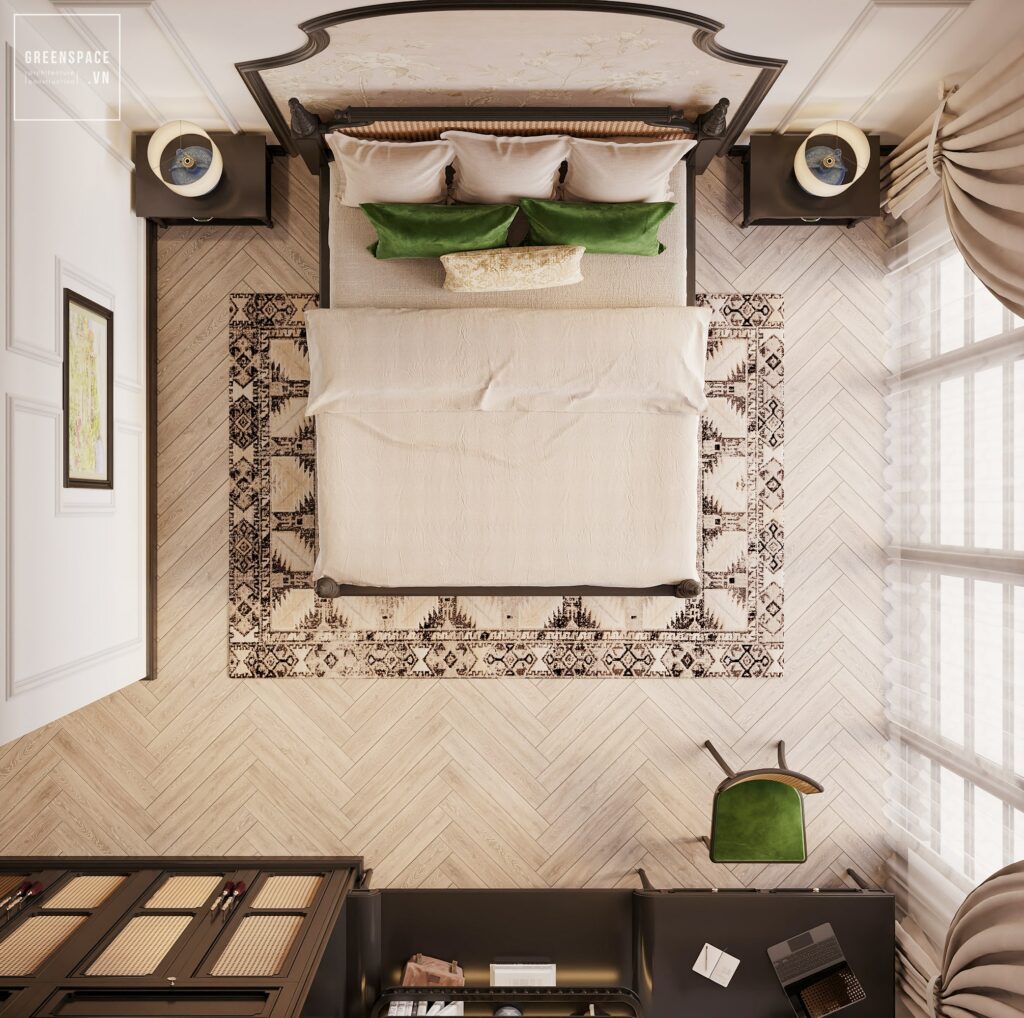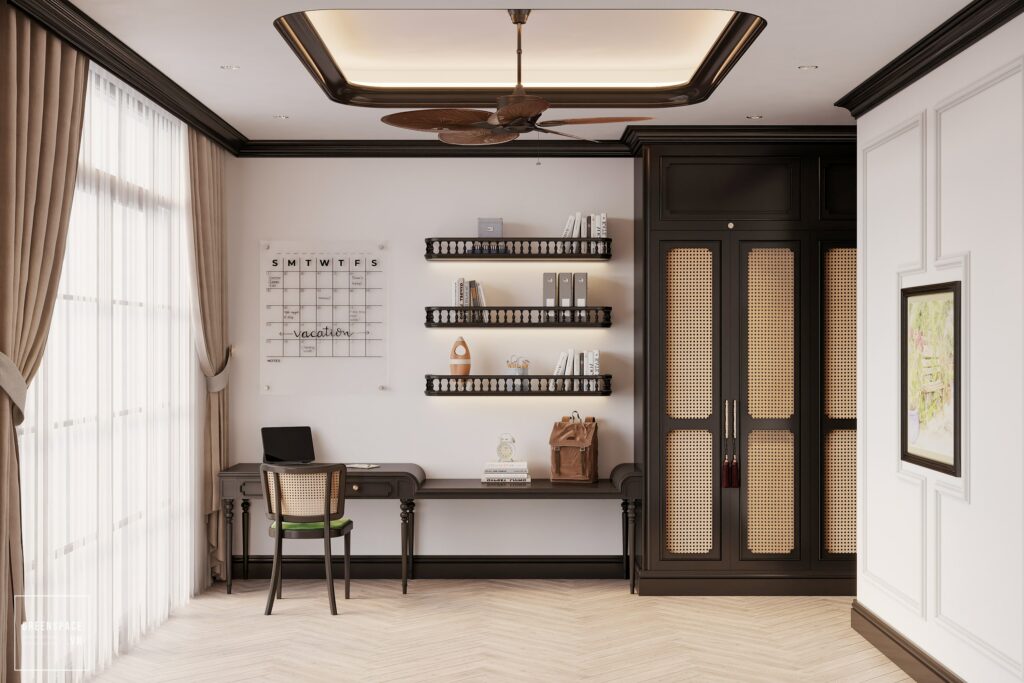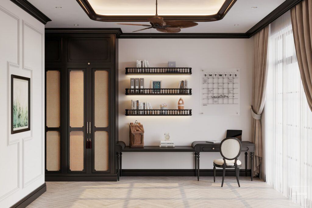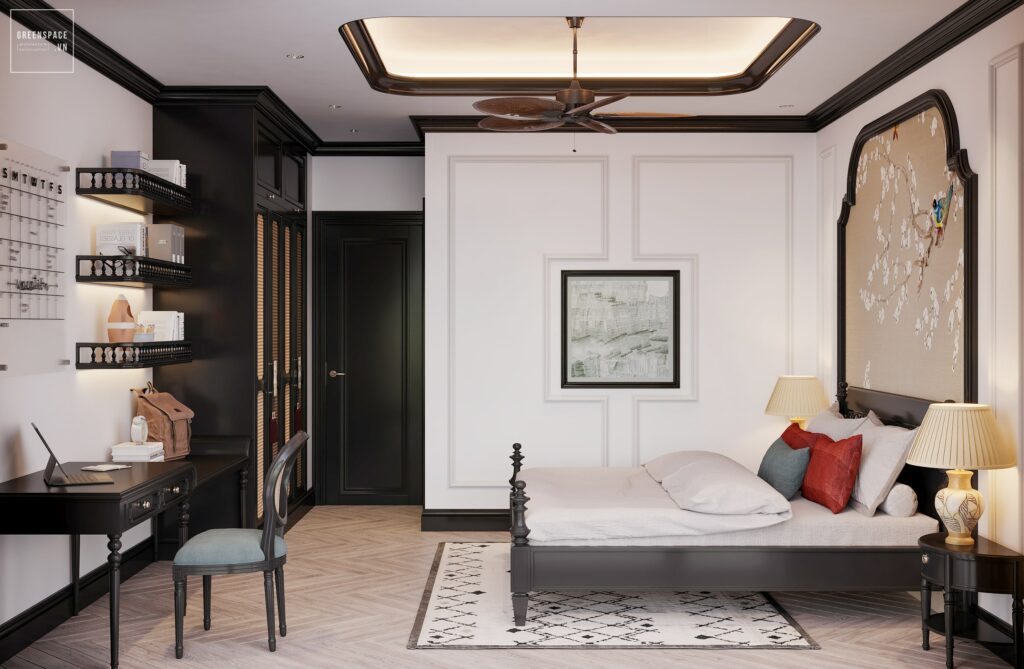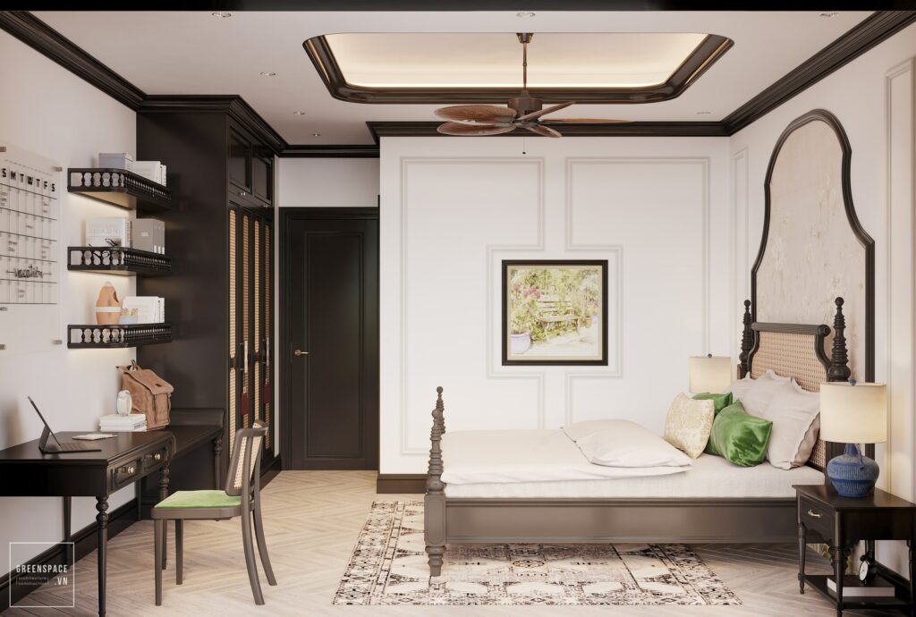 Phía trên tầng là các không gian phòng ngủ nghỉ, thư giãn. Không chỉ chăm chút cho mỗi phòng ngủ master mà kts của KGX còn tỉ mẩn cho từng ngóc ngách nhỏ của các căn phòng ngủ thường. Đảm bảo mỗi phòng đều có những nét độc đáo riêng. Dưới đây là một vài góc trong các căn phòng ngủ thường của dự án thiết kế nhà ở phong cách Indochine tại Vũng Tàu lần này của chúng tôi.