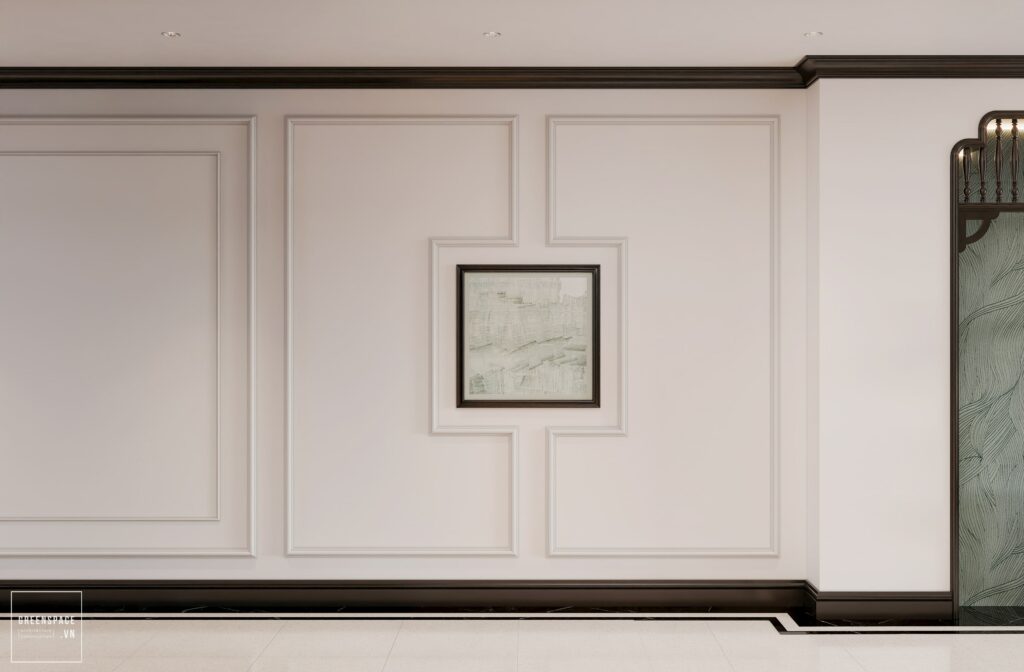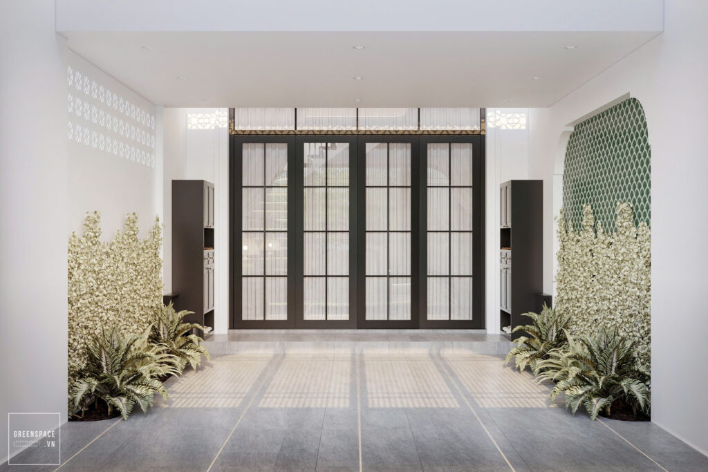Ngôi nhà phố mang phong cách Indochine nổi bật với tường trắng tinh khôi, gợi cảm giác thanh lịch. Cổng gỗ bo tròn, toát lên sự mộc mạc, kín đáo. Các họa tiết nhỏ trên tường được chạm khắc tinh xảo, mang đậm nét cổ kính, tạo nên giao thoa hoàn hảo giữa vẻ đẹp Á Đông và phong cách Pháp cổ điển, đầy quyến rũ.
