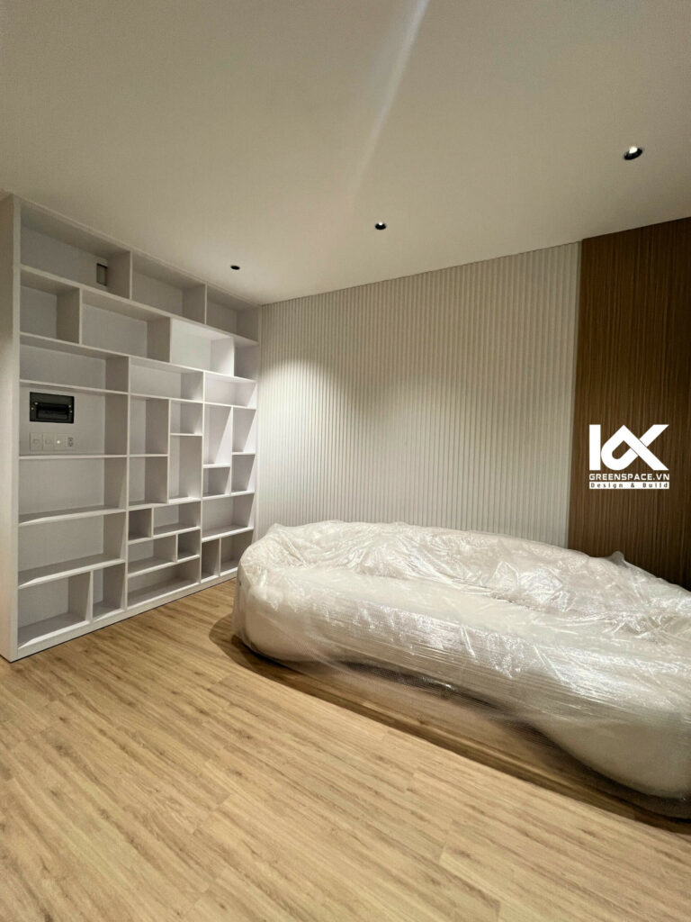 Ở giữa phòng ngủ của 2 con là phòng sinh hoạt chung. Nơi đây có nội thất ấm cúng và thoải mái với bộ sofa mềm mại, là khu vực mà mọi thành viên có thể thư giãn sau những giờ làm việc và học tập căng thẳng. Kế bên là một kệ sách lớn. Điểm nhấn này không chỉ tạo nên sự gọn gàng mà còn góp phần làm cho không gian thêm phần tri thức.