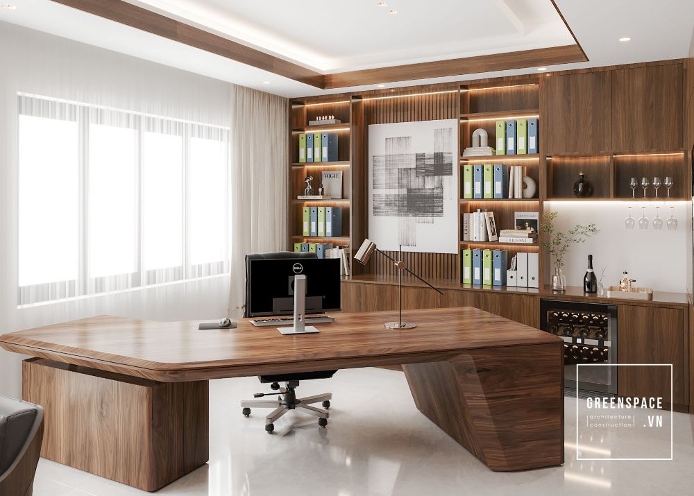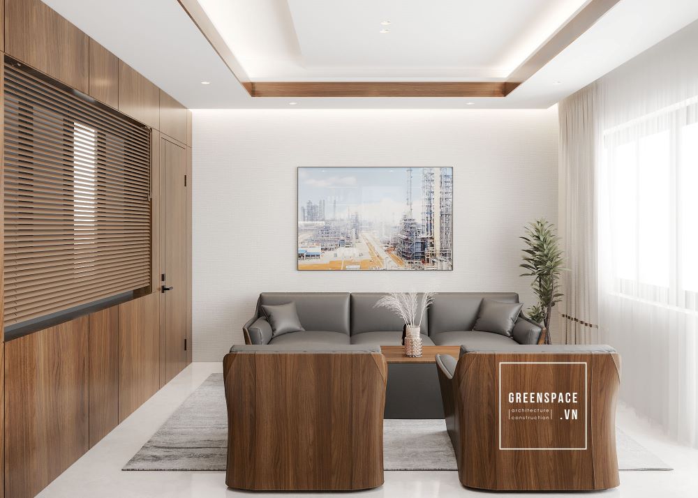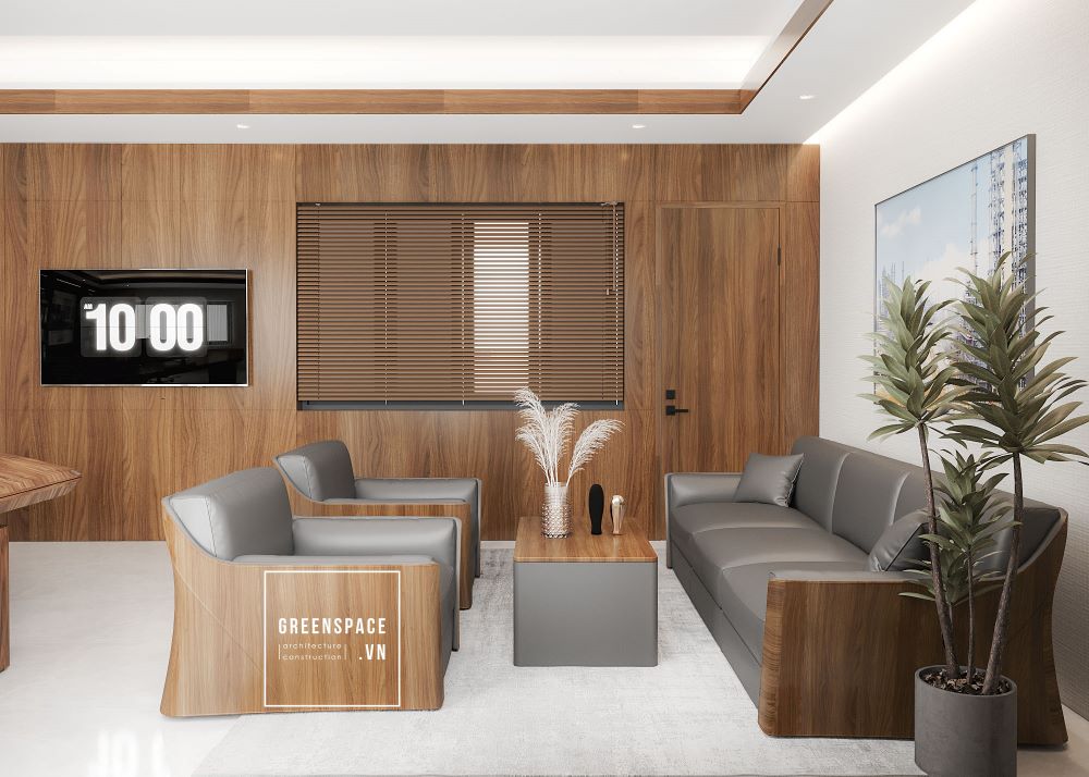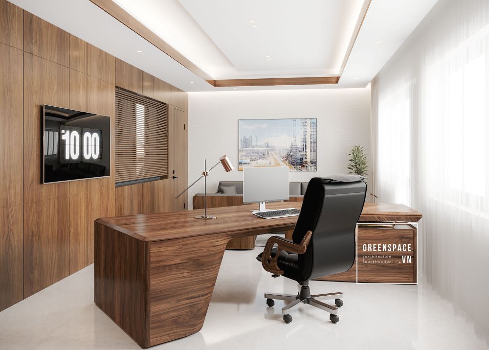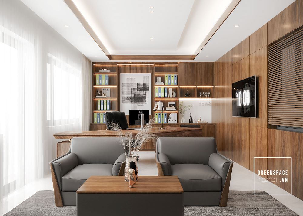 Phòng giám đốc phong cách hiện đại được thiết kế với sự tối giản và sang trọng. Mang lại không gian làm việc chuyên nghiệp. Gam màu trung tính như xám, trắng được kết hợp hài hòa với chất liệu cao cấp như gỗ. Nội thất bao gồm bàn làm việc hiện đại, ghế giám đốc bọc da sang trọng, cùng khu vực tiếp khách với sofa tinh tế. Ánh sáng tự nhiên được tận dụng qua cửa sổ lớn. Kết hợp đèn LED tạo cảm giác thoáng đãng và ấm áp. Tất cả hướng đến sự tiện nghi, đẳng cấp, và thể hiện phong thái lãnh đạo.