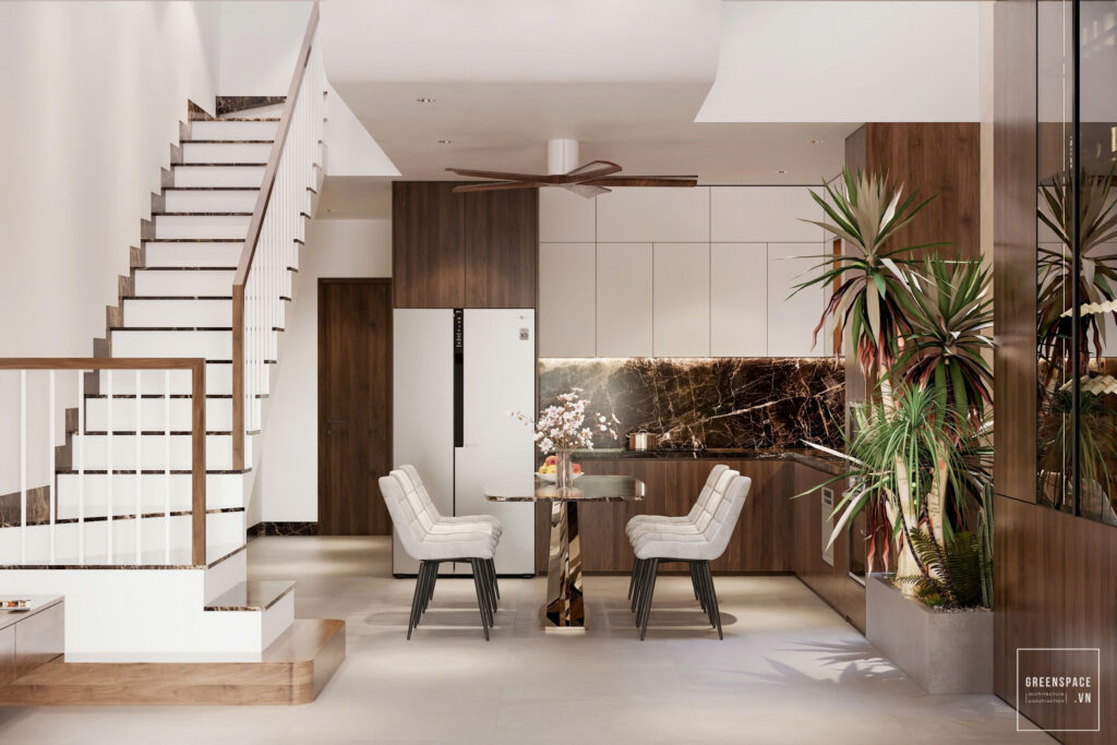 Ngoài ra, việc loại bỏ vách ngăn giữa không gian khách bếp cũng giúp nhà cửa sáng sửa hơn rất nhiều. Phần kệ bếp kiểu chữ L tiện ích và tối ưu công năng. Khoảng trống dưới chân cầu thang cũng được tận dụng để bố trí kệ tủ thông minh. Nhìn chung, tuy diện tích khá hạn chế nhưng kts của KGX đã “hô biến” không gian khách bếp thật thẩm mỹ mà vẫn tiện ích vô cùng.