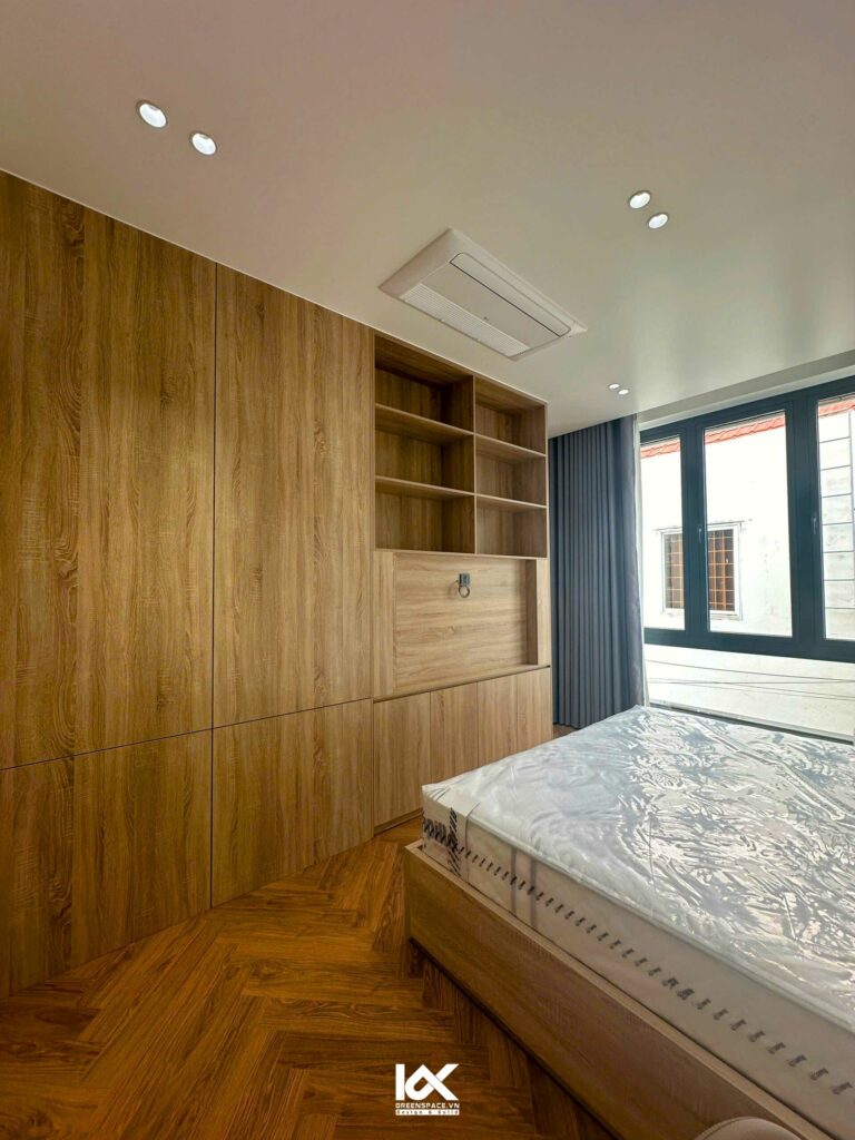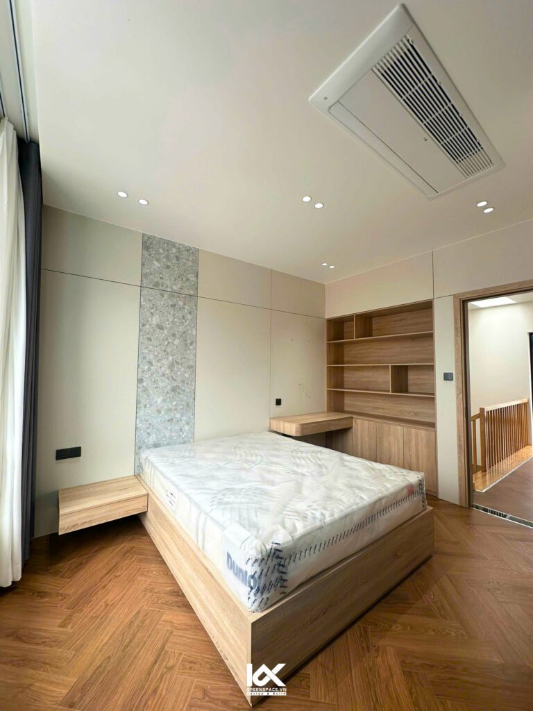 Tiếp theo không gian tầng 2 là phòng ngủ master, nơi mang đến sự yên bình và thư giãn tuyệt đối. Nội thất trong phòng được lựa chọn tinh tế, với sự kết hợp hài hòa của các yếu tố nhẹ nhàng, mang đến một bầu không khí thanh thoát và dễ chịu. Màu sắc chủ đạo của căn phòng là những gam màu nền nã. Tạo cảm giác thư thái và dễ dàng giúp người sử dụng tận hưởng giấc ngủ sâu. Chiếc giường lớn đặt ở trung tâm. Khiến không gian này trở thành nơi lý tưởng để thư giãn và tái tạo năng lượng sau những ngày dài bận rộn.