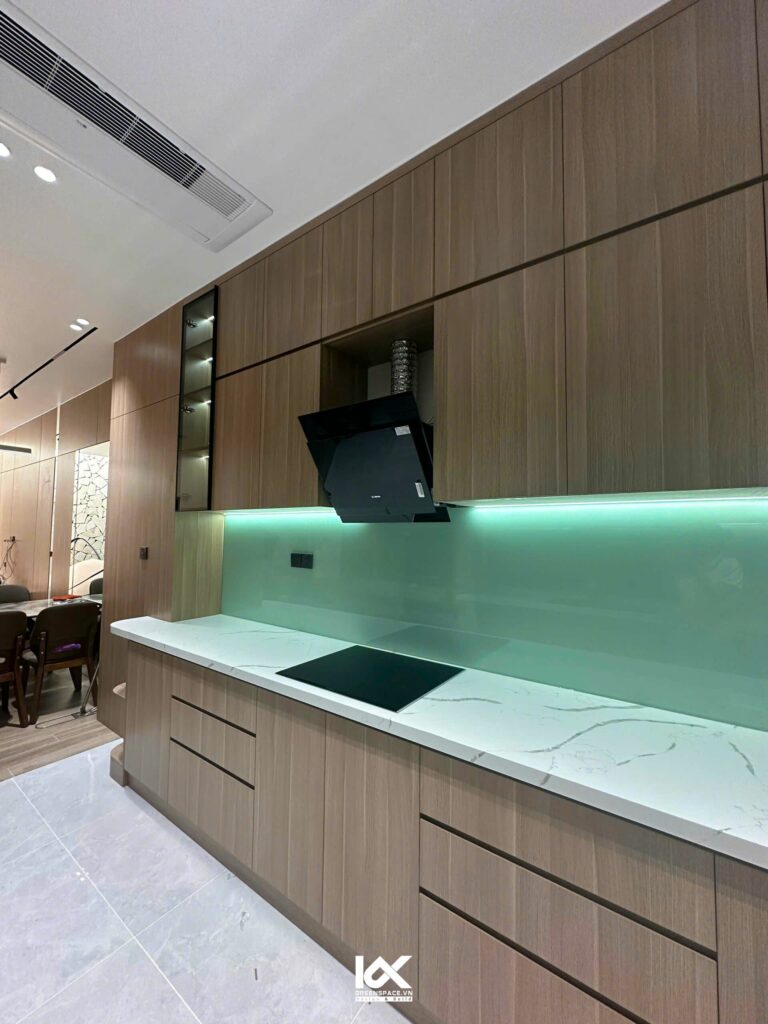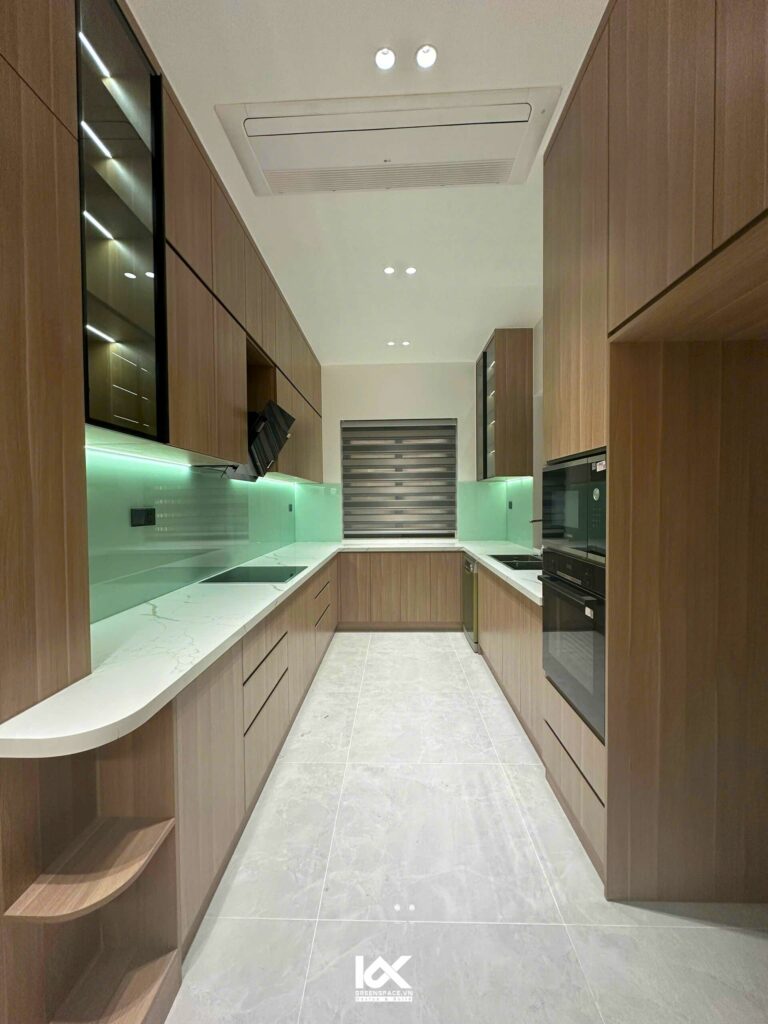 Điểm độc đáo của dự án này được thể hiện rõ nét ngay từ khi bước vào không gian khách bếp. Thay vì theo cách bố trí truyền thống, căn bếp đã được đưa ra phía mặt tiền. Tạo cảm giác gần gũi và chào đón ngay từ cửa vào. Phòng khách được dời ra phía sau, mang đến không gian sinh hoạt yên tĩnh và riêng tư.
