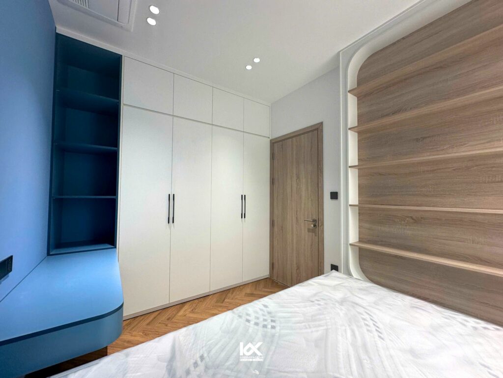 Nội thất phòng ngủ cho bé được thiết kế với đường nét mềm mại hơn. Chi tiết nội thất cũng được chú trọng lành mạnh, thân thiện với trẻ em như tay nắm cửa ít góc cạnh, kệ tủ đựng đồ chơi có tầm cao trung bình, thuận tiện cho các trẻ sử dụng.