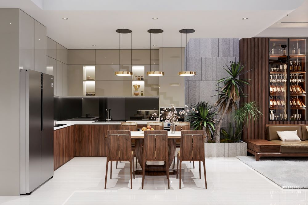 Phòng khách và bếp được thiết kế theo phong cách không gian mở, tạo cảm giác rộng rãi và thoáng mát. Nội thất phòng khách gồm sofa hiện đại và bàn trà thấp với tông màu trầm, kết hợp cùng kệ tivi đơn giản nhưng sang trọng. Bếp liền kề với bàn ăn sử dụng tủ bếp âm tường tối ưu không gian và mang lại sự tiện dụng. Đèn thả hiện đại ở khu vực bàn ăn cùng hệ thống đèn âm trần trong phòng khách tạo điểm nhấn độc đáo và sự liên kết giữa hai khu vực.