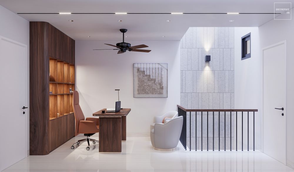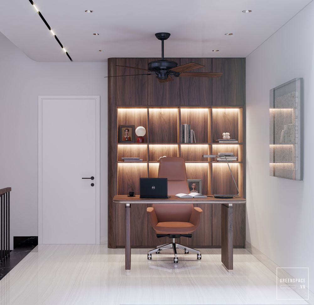 Phòng làm việc được thiết kế tối giản nhưng đầy đủ tiện nghi và sang trọng. Bàn làm việc gỗ tự nhiên kết hợp ghế da cao cấp tạo sự thoải mái. Kệ sách âm tường với đèn hắt sáng tinh tế mang lại vẻ hiện đại và ấm cúng. Không gian được bố trí khoa học, đảm bảo tập trung và hiệu quả làm việc tối đa. Trần nhà lắp quạt trần giúp lưu thông không khí và tăng sự thoáng mát
