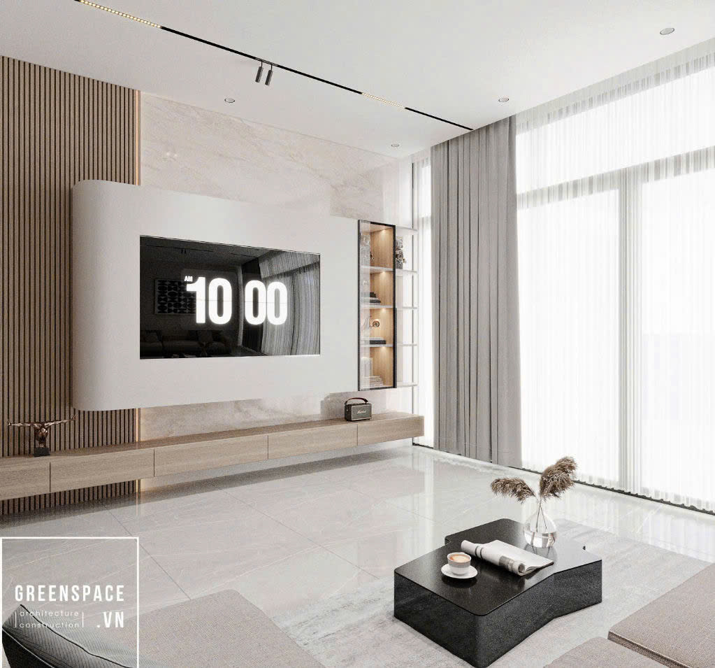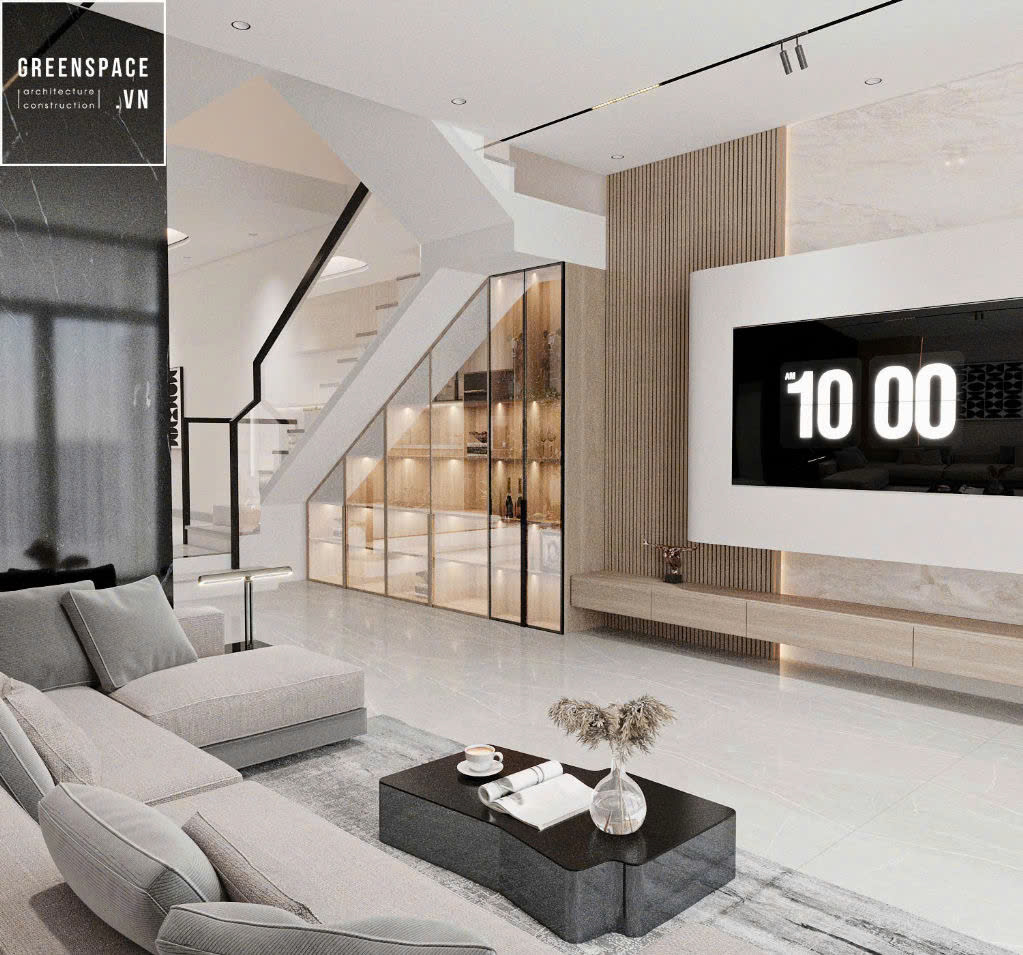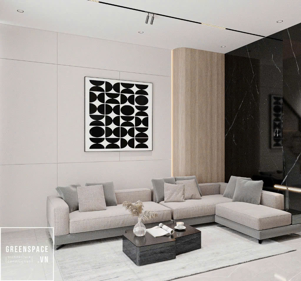 Phòng khách được bố trí ghế sofa lớn màu xám nhạt, bàn trà tối giản cùng hệ kệ treo tường kết hợp tivi hiện đại. Các chi tiết trang trí như tranh nghệ thuật, đèn thả trần và mảng tường nhấn màu đen giúp không gian thêm sang trọng.