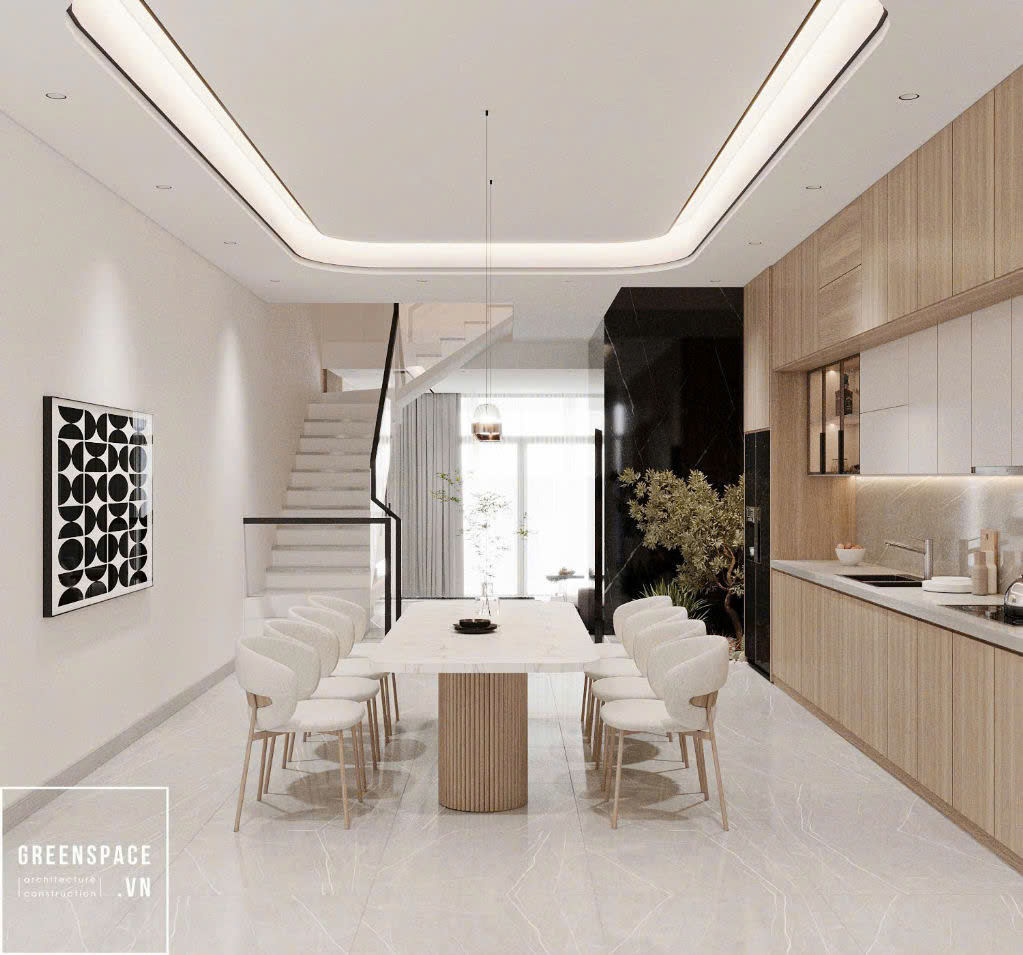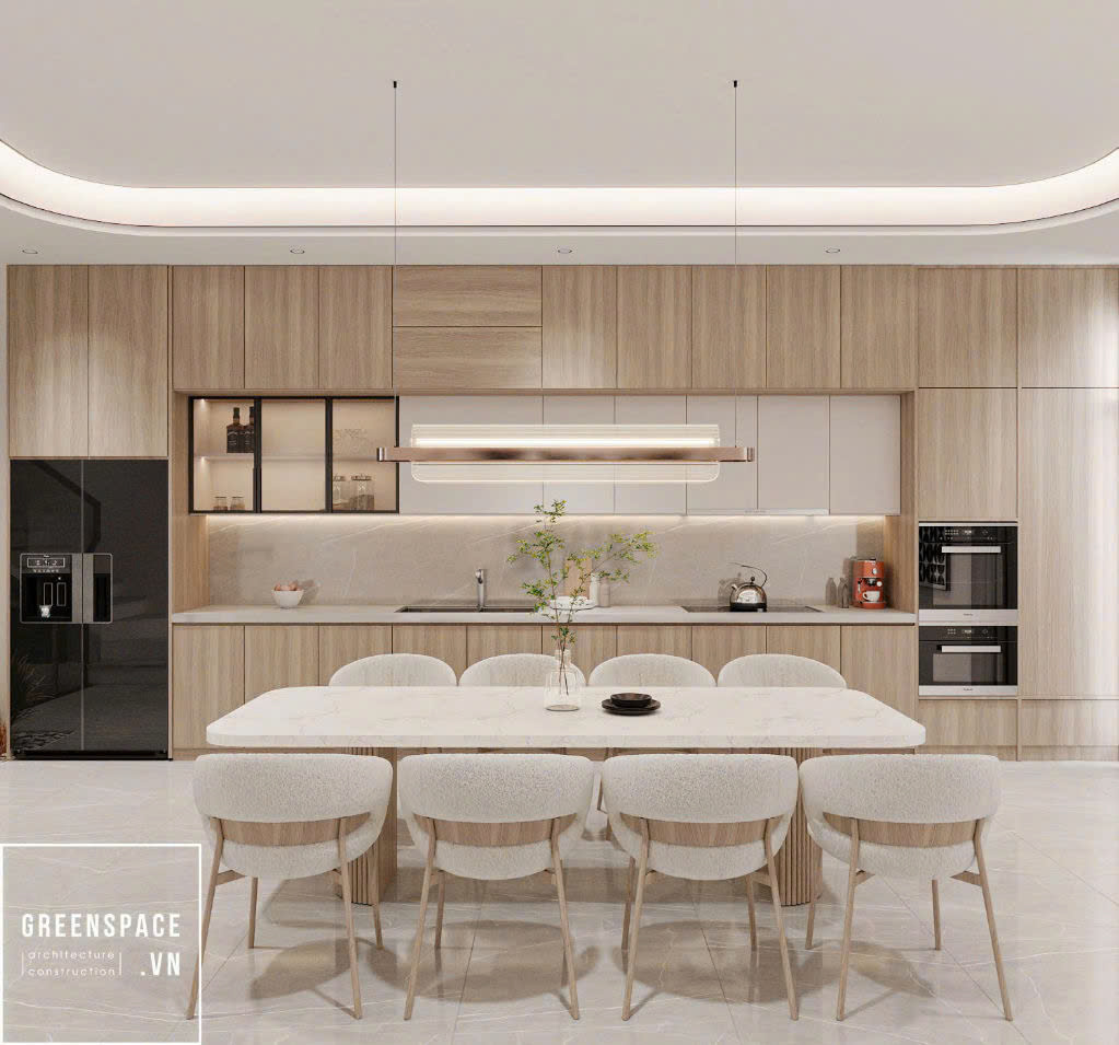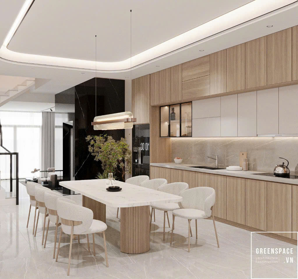 Khu vực bếp sử dụng hệ tủ gỗ thiết kế phẳng, kết hợp mặt đá trắng tạo cảm giác thanh lịch và sạch sẽ. Bàn ăn dài với ghế bọc nệm sáng màu mang đến sự thoải mái. Hệ đèn LED âm trần giúp không gian thêm ấm cúng nhưng vẫn đủ sáng.