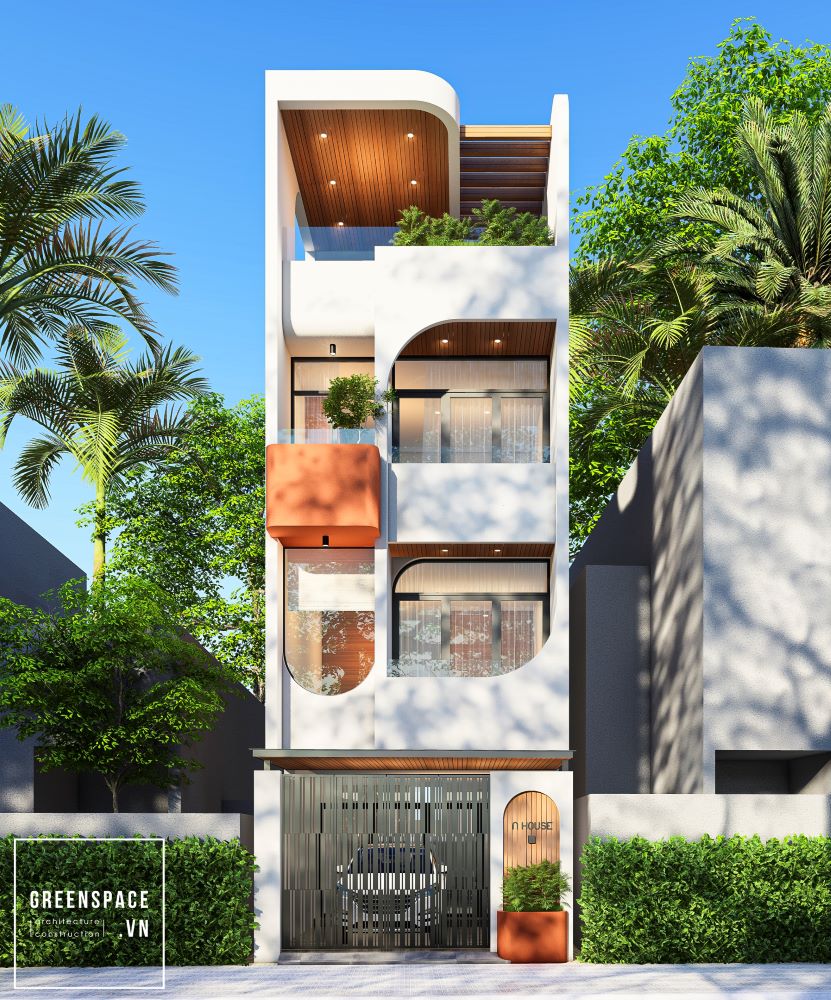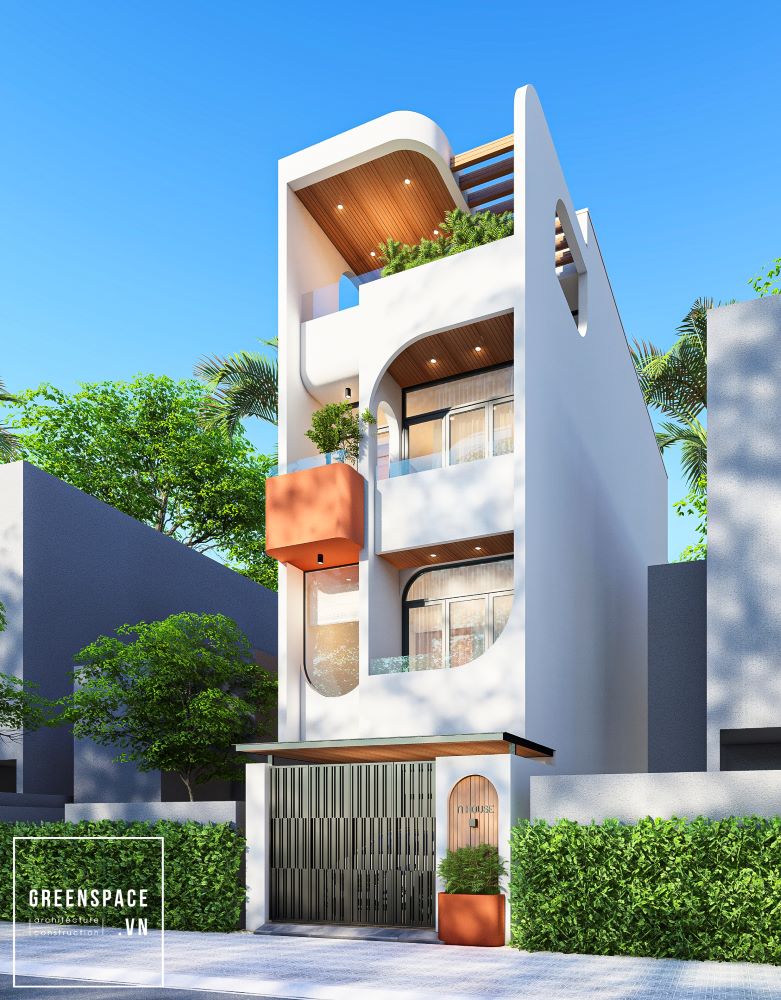 Ngôi nhà phố mang phong cách hiện đại với thiết kế tối giản nhưng đầy tinh tế. Các đường nét bo tròn tạo điểm nhấn mềm mại và khác biệt. Màu trắng chủ đạo kết hợp gỗ và cây xanh mang lại sự hài hòa.