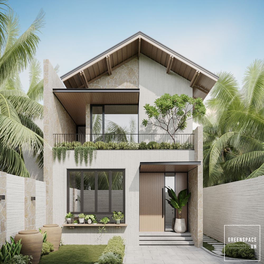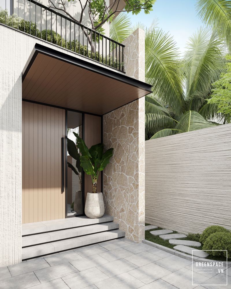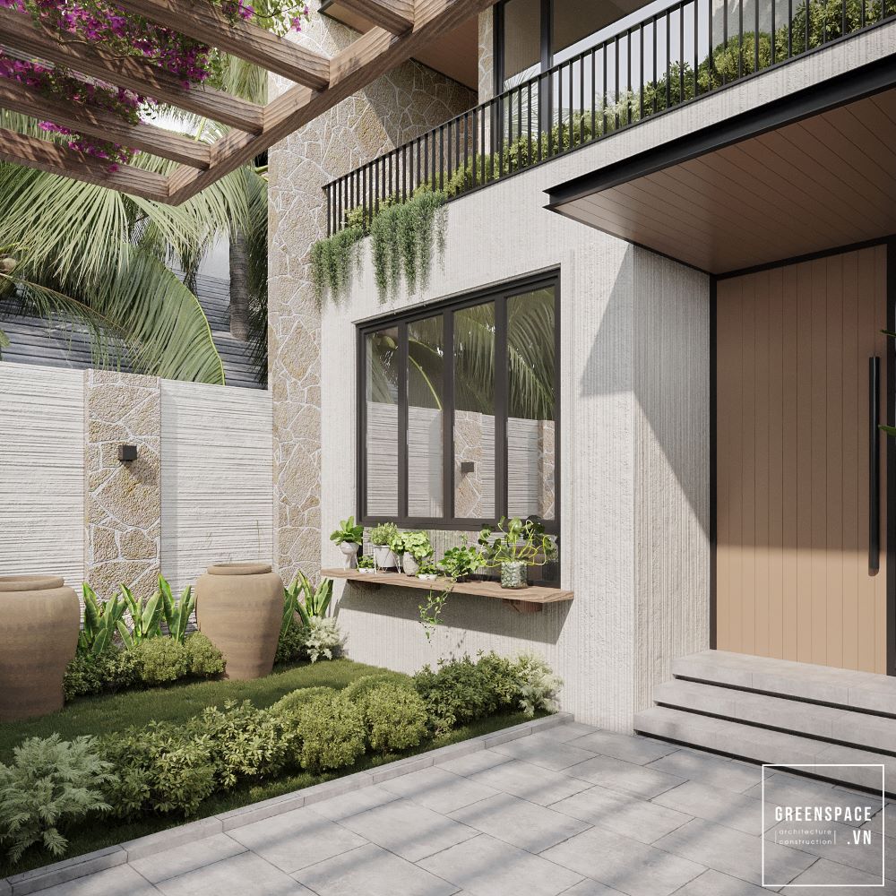 Biệt thự sử dụng tông màu trung tính với chất liệu bê tông, gỗ và kính, tạo nên vẻ đẹp thanh lịch. Mặt tiền rộng rãi kết hợp cùng mảng xanh thiên nhiên, giúp không gian hài hòa và thoáng đãng. Thiết kế mái dốc hiện đại, kết hợp cửa kính lớn giúp tận dụng tối đa ánh sáng tự nhiên. Khu vực cổng vào ấn tượng với bậc thềm dẫn lối, kết hợp tiểu cảnh xanh tạo cảm giác thư thái.