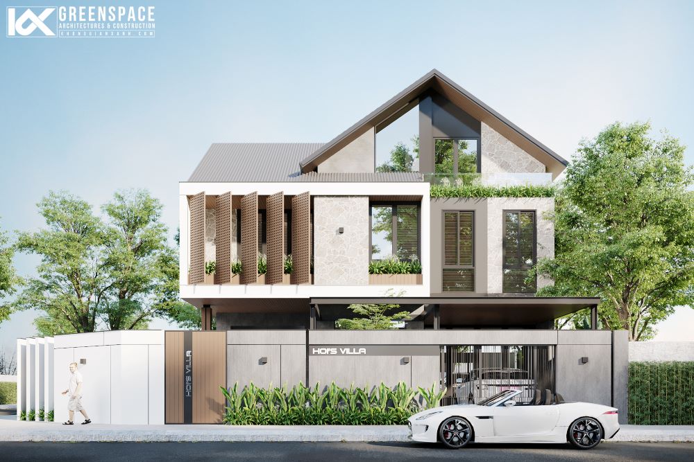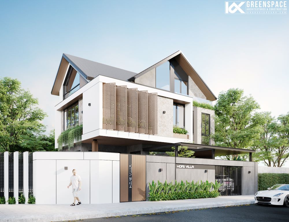 Sử dụng mái dốc kiểu chữ A, mang nét kiến trúc hiện đại kết hợp truyền thống. Dùng tông màu trung tính nhẹ nhàng (xám, trắng, nâu), kết hợp các thanh lam dọc tạo sự mềm mại.