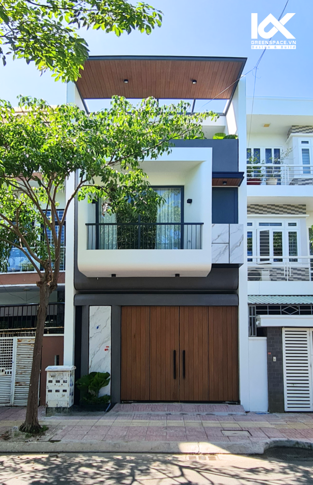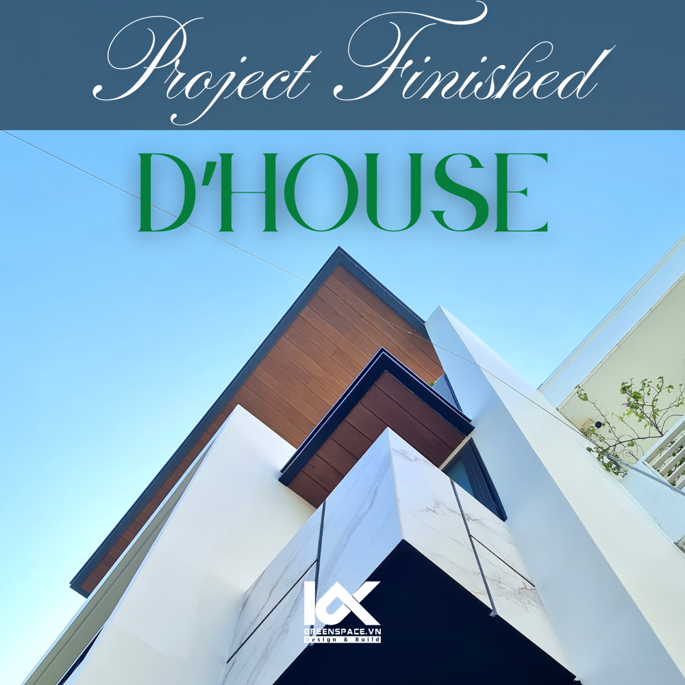 D’House nổi bật với mặt tiền vuông vức, hiện đại. Mảng ốp gỗ composite phối đá marble tạo điểm nhấn sang trọng. Ban công kính đen tối giản mang đến vẻ tinh tế. Cửa chính 2 cánh ốp gỗ cao cấp tạo cảm giác vững chãi. Tầng thượng được thiết kế mái lam giúp lấy sáng tối ưu. Mặt tiền sơn trắng phối xám than tạo độ tương phản mạnh. Cây xanh bố trí hợp lý mang đến cảm giác hài hòa.