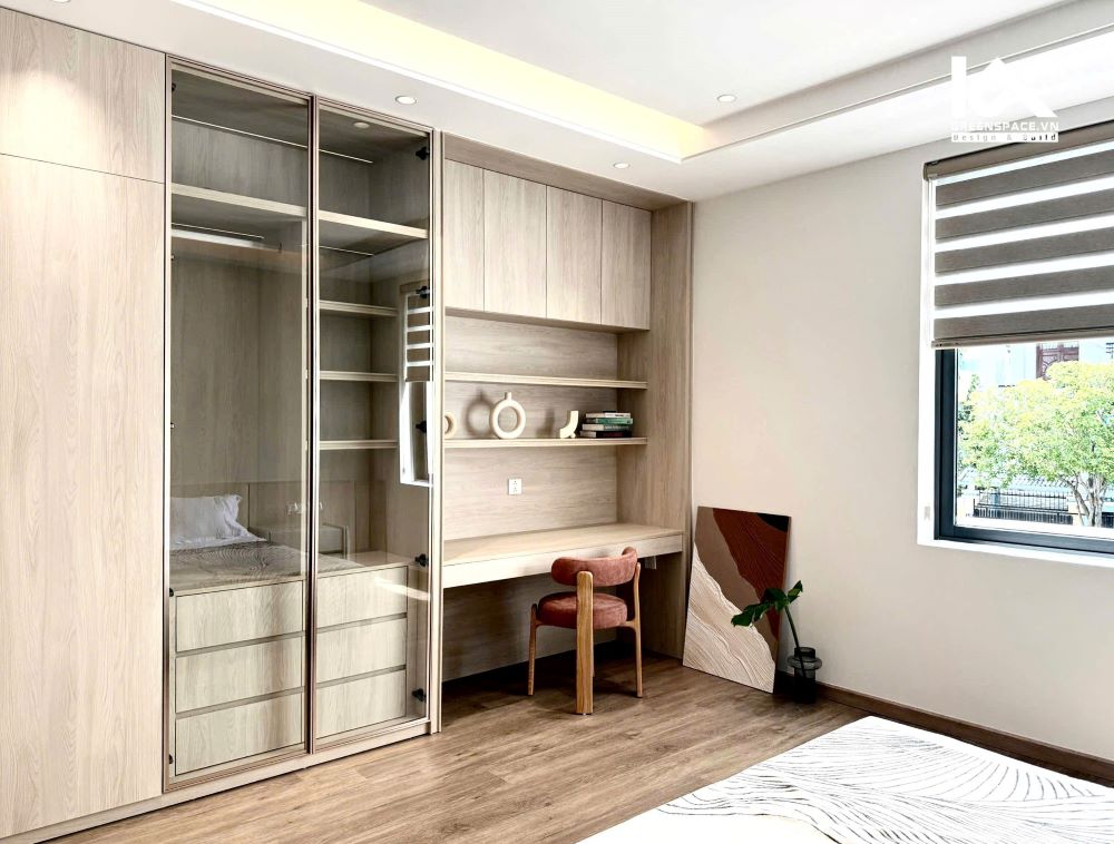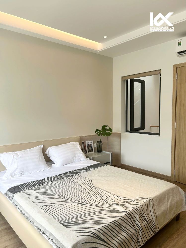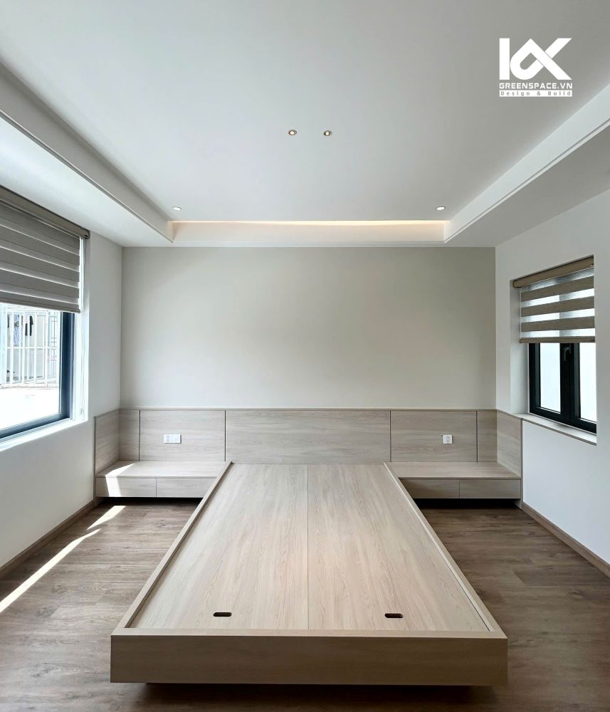 Nội thất D’House theo phong cách tối giản nhưng ấm cúng. Vật liệu gỗ công nghiệp chống ẩm phủ melamine bền đẹp. Phòng khách kết nối bếp ăn trong không gian mở. Tông màu be – nâu trung tính xuyên suốt toàn bộ nhà. Hệ tủ âm tường giúp tối ưu diện tích và công năng. Trần thạch cao kết hợp đèn LED âm trần tạo ánh sáng dịu nhẹ. Phòng ngủ rộng thoáng với cửa sổ lớn đón ánh sáng tự nhiên.
