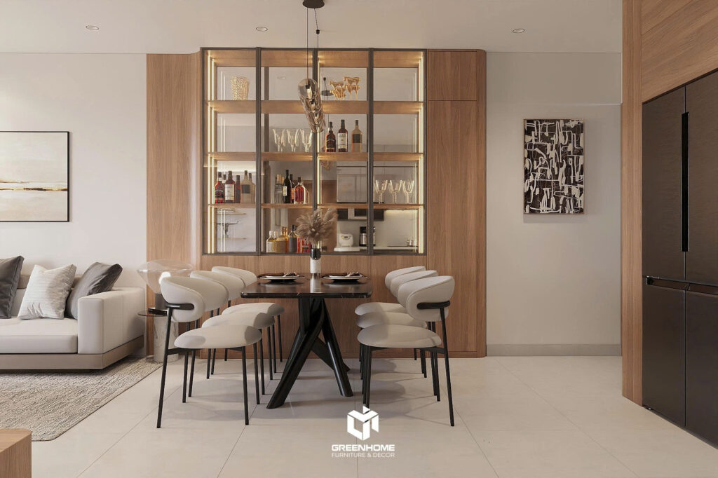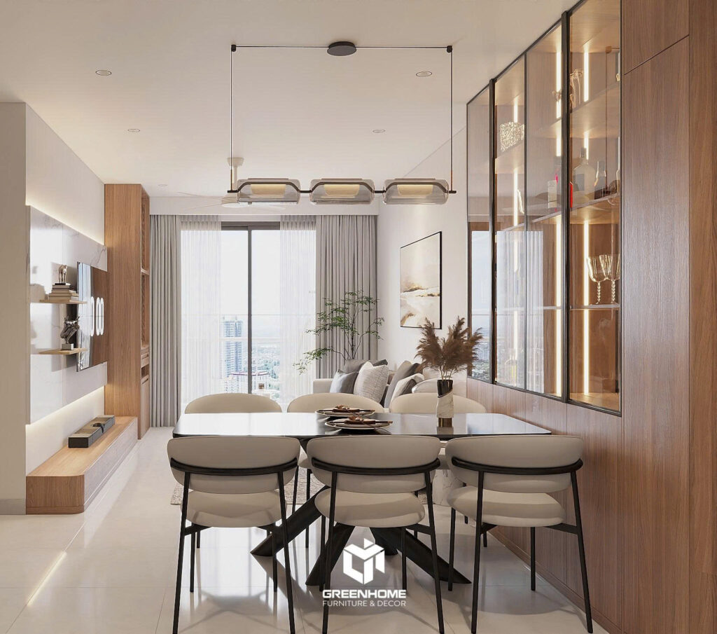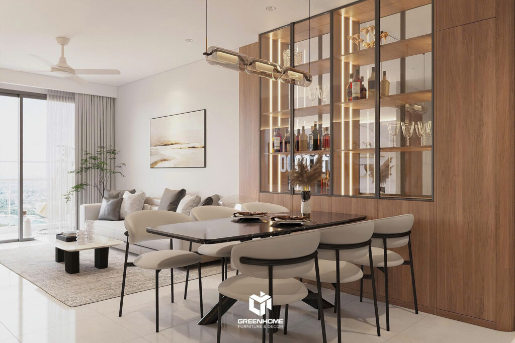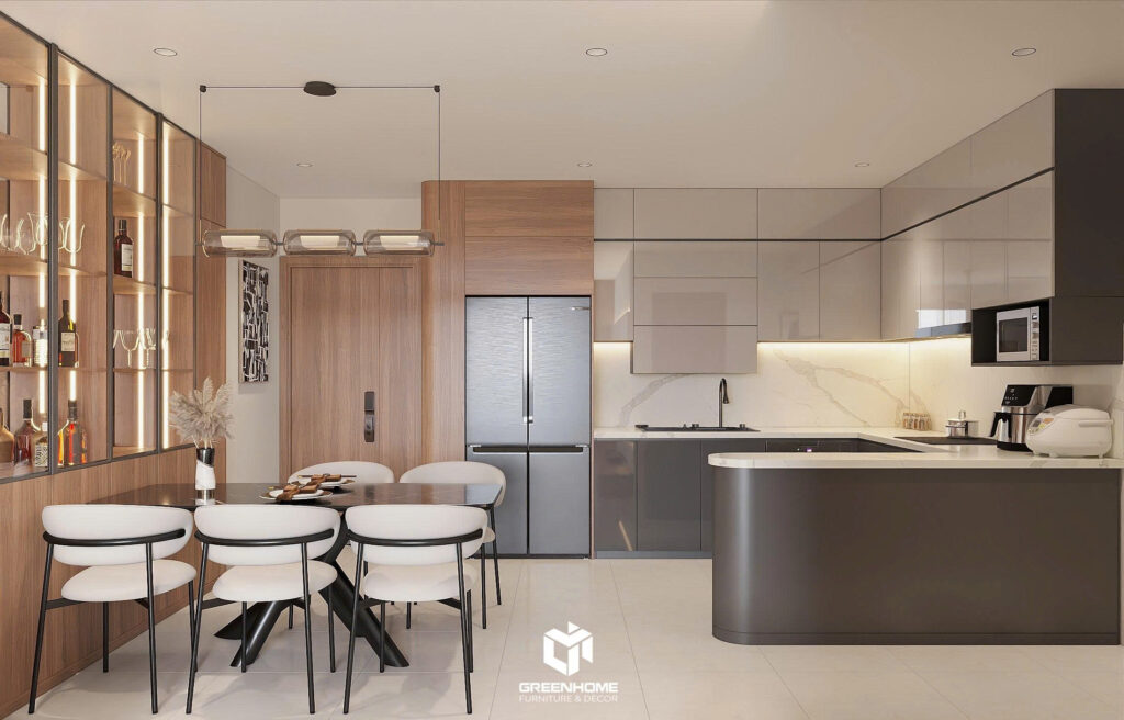 Phòng khách mang phong cách hiện đại với sofa trung tính, bàn trà tối giản và tủ rượu âm tường sang trọng. Ánh sáng tự nhiên tràn ngập từ ban công, tạo cảm giác thoáng đãng và ấm cúng. Kệ tivi treo tường tiết kiệm diện tích hiệu quả. Phòng bếp thiết kế hiện đại với hệ tủ bếp acrylic bóng gương sang trọng. Đảo bếp cong mềm mại tạo điểm nhấn và tăng công năng sử dụng. Bếp liên thông với phòng khách tạo không gian mở tiện nghi. Tủ bếp phủ laminate bóng gương sang trọng và dễ lau chùi. Khu vực bàn ăn đặt cạnh tủ rượu kính, kết hợp đèn thả tinh tế, mang lại không gian ấm cúng và tiện nghi cho cả gia đình. Khu bàn ăn bố trí cạnh cửa kính đón ánh sáng tối đa.