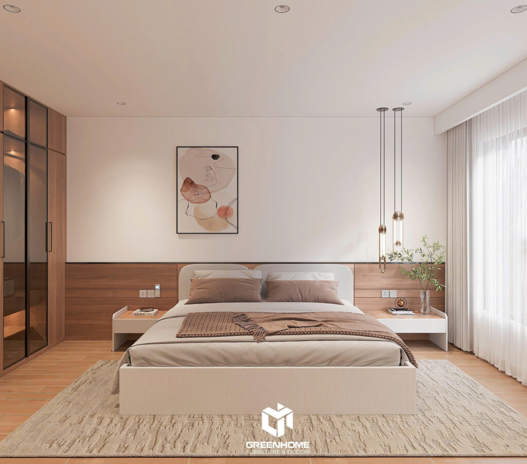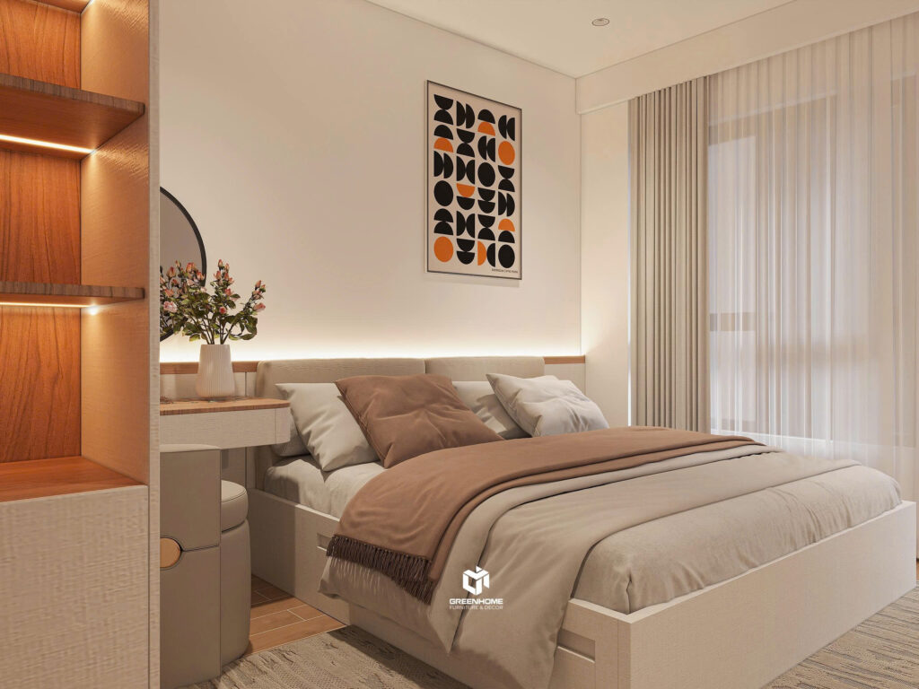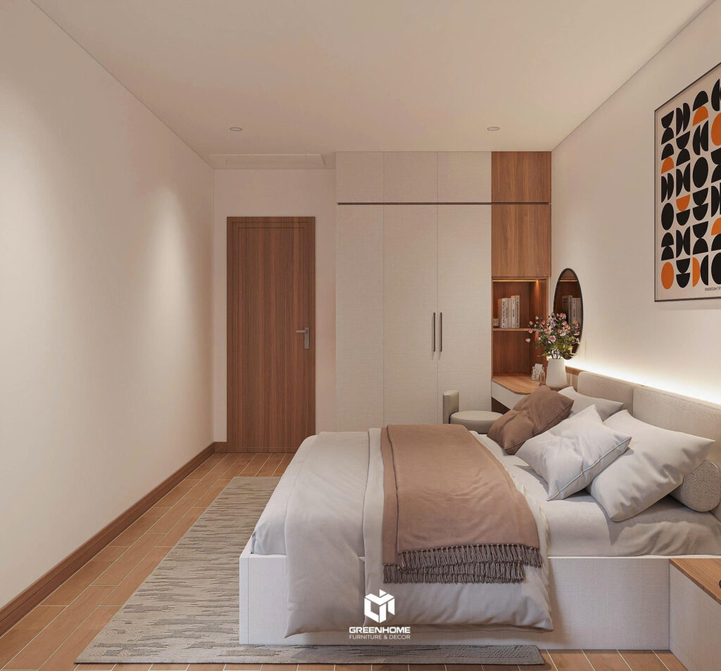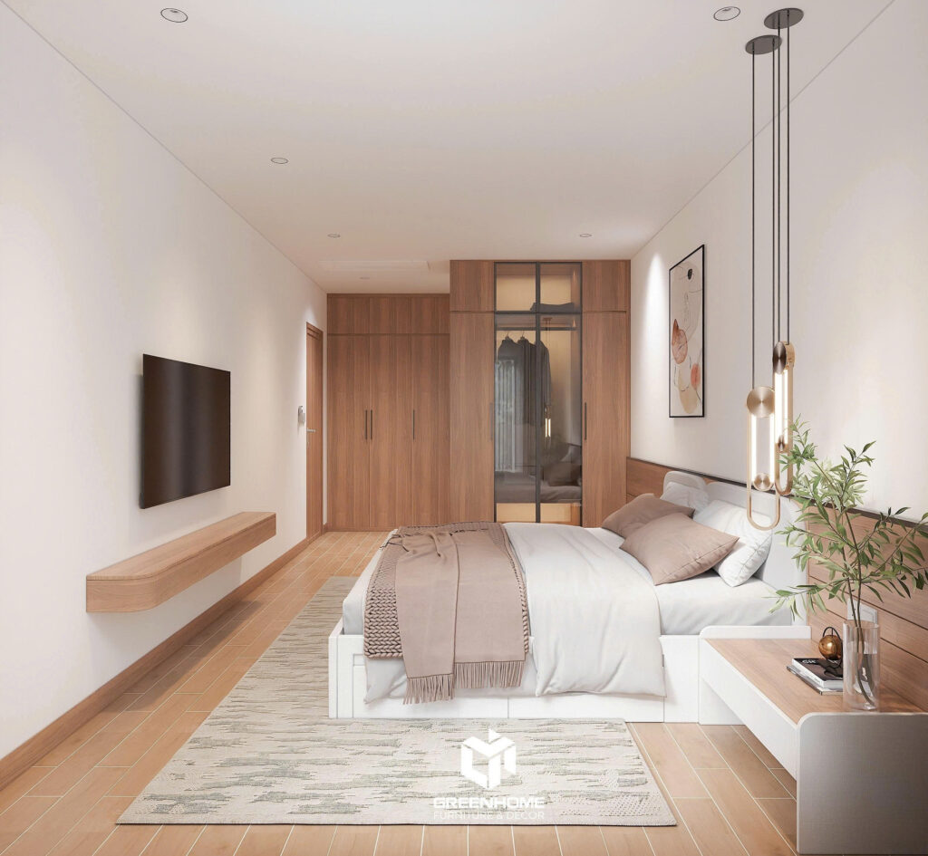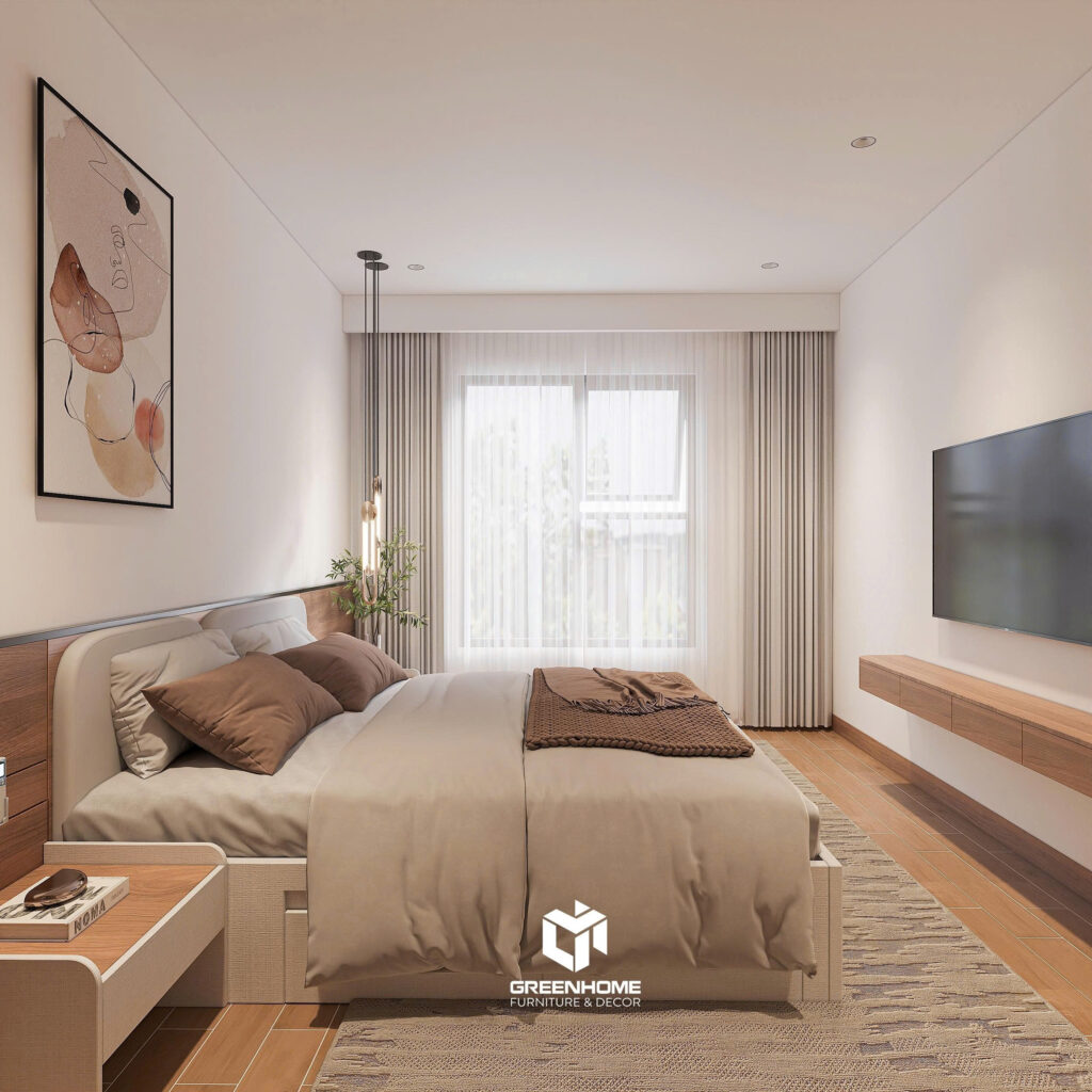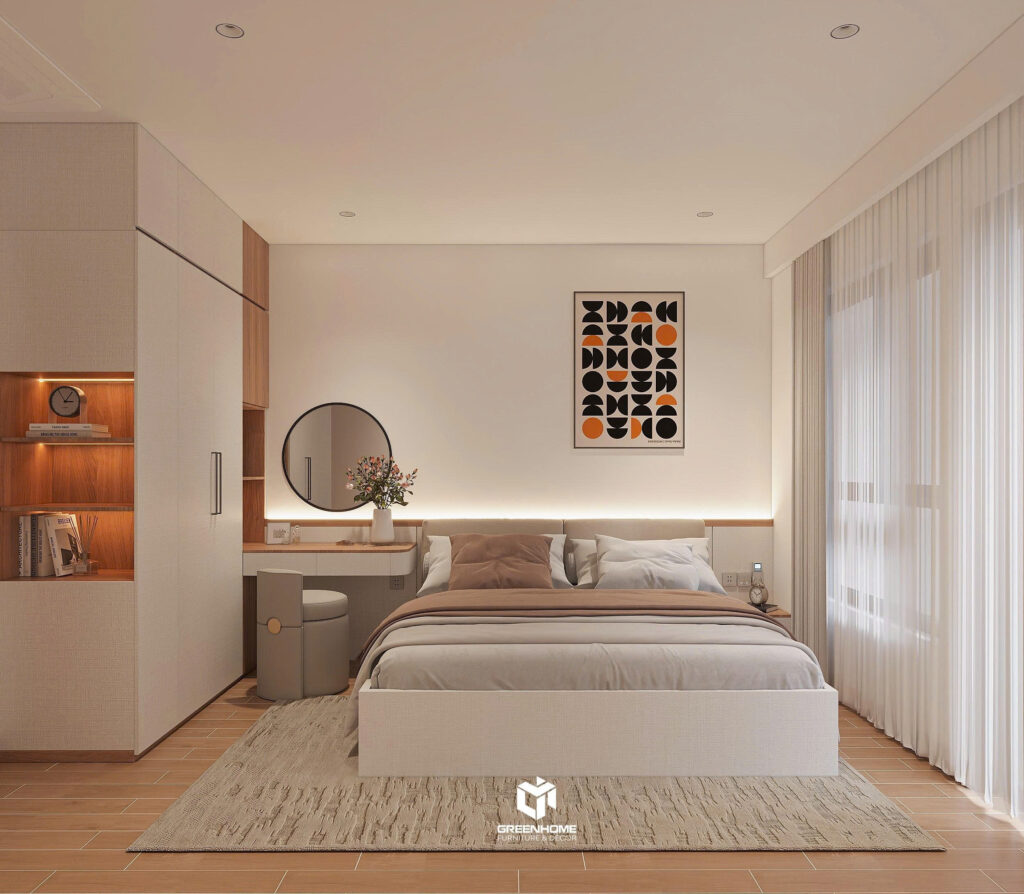 Phòng ngủ master sử dụng gam màu be – trắng dịu nhẹ, mang lại cảm giác thư giãn. Giường bọc nệm kết hợp tap đầu giường tích hợp kệ tiện dụng. Tủ quần áo âm tường cánh kính tạo chiều sâu cho không gian. Đèn thả nghệ thuật và cây xanh tăng sự ấm cúng, tinh tế. TV treo tường và kệ cong gỗ giúp tối ưu diện tích hiệu quả.