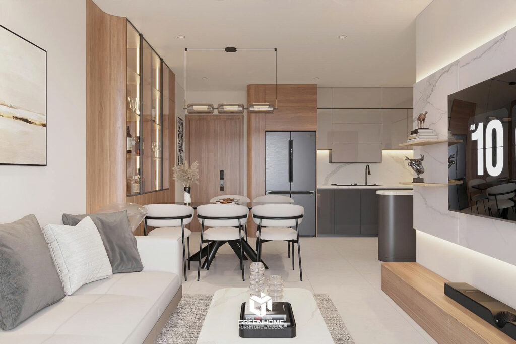 Thiết kế nội thất chung cư Centre Point Vũng Tàu sử dụng đường nét gọn gàng, vật liệu bền đẹp, kết hợp bảng màu trung tính như trắng – kem – nâu gỗ, tạo nên cảm giác sang trọng và hài hòa