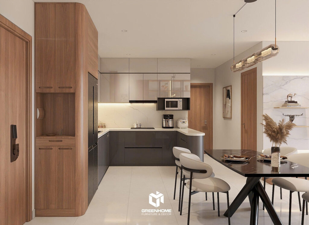 Tối ưu hóa công năng với tủ âm tường, bếp mở, bàn ăn gấp gọn… giúp tiết kiệm diện tích nhưng vẫn đầy đủ tiện ích cho sinh hoạt.
