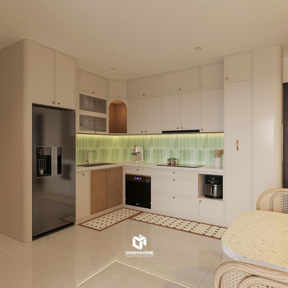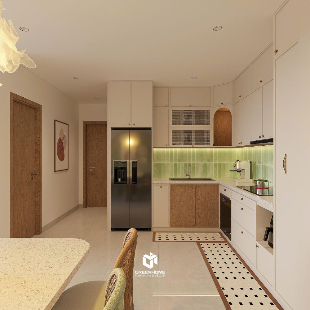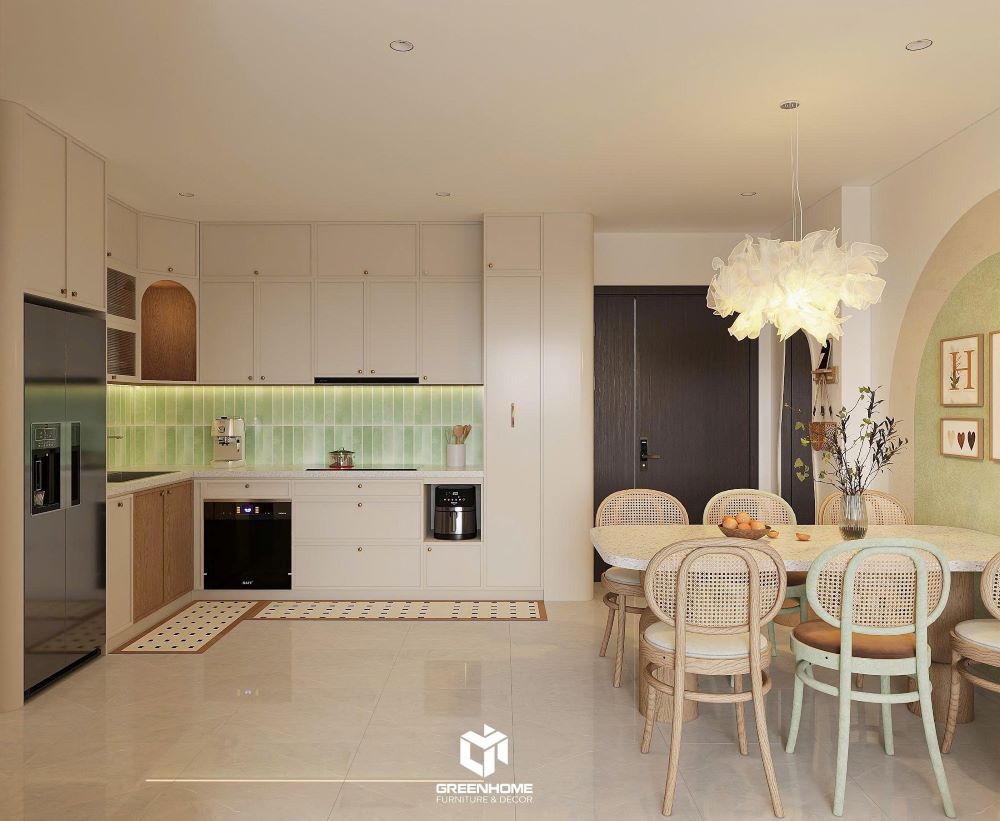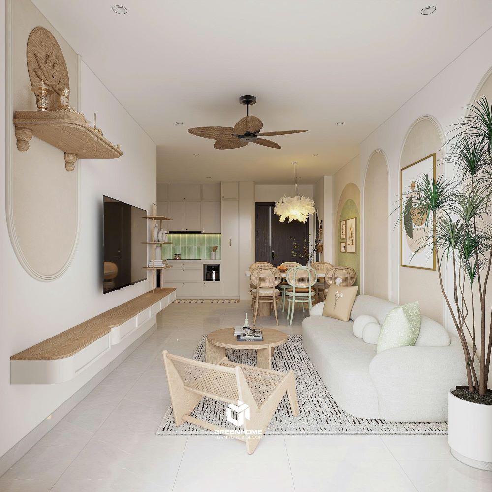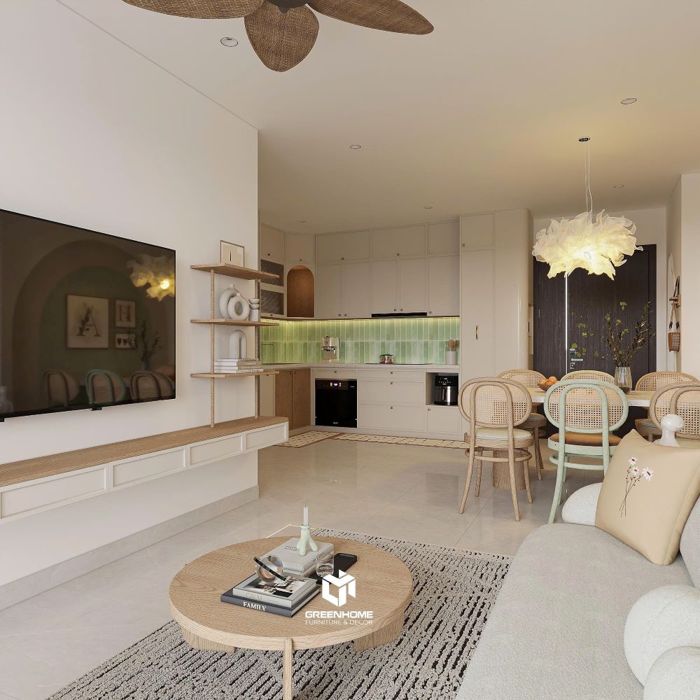 Phòng khách bố trí ghế sofa sáng màu. Tivi treo tường kết hợp tủ âm đơn giản. Bàn ăn gỗ kết nối liền bếp mở. Tủ bếp trên dưới hiện đại, phối màu trắng kem. Ánh sáng vàng tạo cảm giác ấm áp.