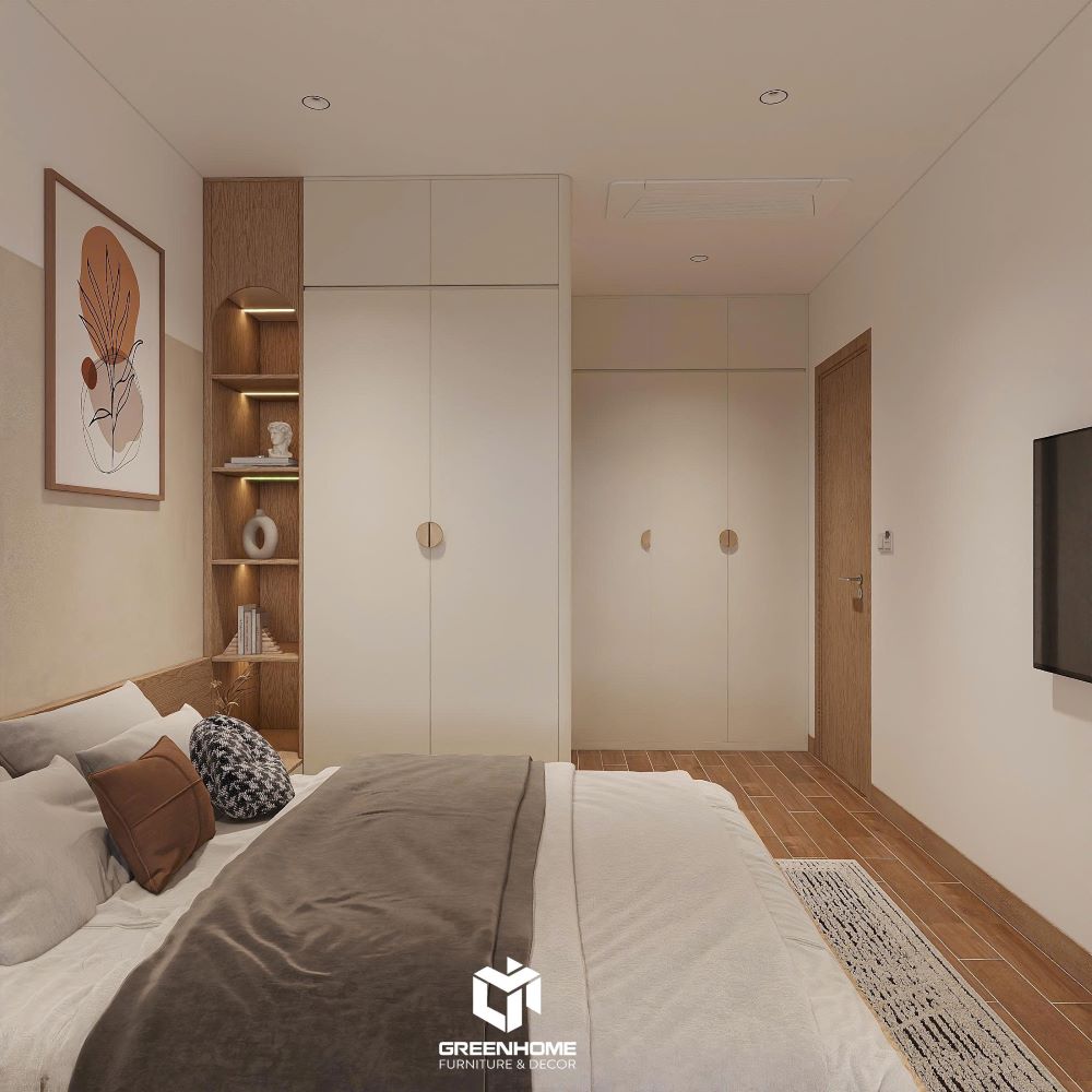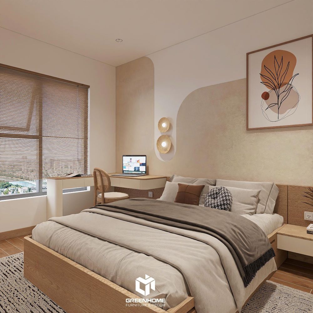 Giường lớn bọc nệm tông trung tính. Bàn trang điểm đặt sát cửa sổ. Tủ quần áo âm tường giúp tiết kiệm diện tích. Tranh trang trí đầu giường mang nét nghệ thuật. Rèm vải dày cản sáng hiệu quả.